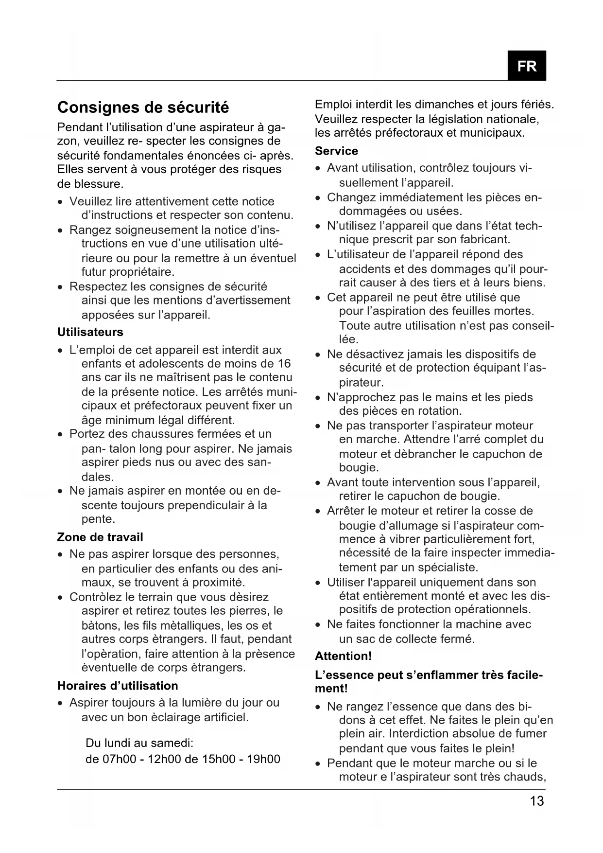 - Tous droits réservés. Dispositifs de sécurité Entrier de sécurité En cas de danger. relâchez l’étrier de sécu- rité. Le moteur et le ventilateur d’immobili- sent. Il est interdit de rendre l’étrier de sécu- rité inopérant. Signification des symboles apposès sur l’appareil Lisez le mode d’emploi! Veillez à ce que personne ne se trouve à proximité! Avant toute intervention sous l’appareil, retirer le capuchon de bougie. Attention danger! Eloigner les pieds et les mains de l’aspirateur quand il est fonctionnement! Relâcher le frein- moteur. Dans cette notice d’utilisation Danger! L’irrespect des ins- tructions précédées de ce symbole engendre un risque de dommages corporels. Montage Avant de monter cet appareil, veuillez lire la no- tice de montage à part accompagnant l’appareil. Respect de l’environnement, dépollution Les appareils usagés ne doivent pas être mis au rebut avec les déchets ménagers! L’emballage, l’appareil et ses accessoires sont fabriqués en matériaux recyclabes et sont à éliminer selon la réglementation ap- pliquée dans votre pays. Mise en service Ne mettez pas l’appareil en service tant que vous n’avez pas entièrement fini de le mon- ter. Le chiffre imprimé à gauche du texte (par ex. (1)) renvoie aux figures. Respectez impérativement la notice d’ins- tructions publiée par le fabricant du moteur à essence t livrée avec ce dernier. Avant le première mise en service, faites le plein d’huile et d’essence. Essence: normale sans plomb Huile moteur: voir la notice d’instructions15