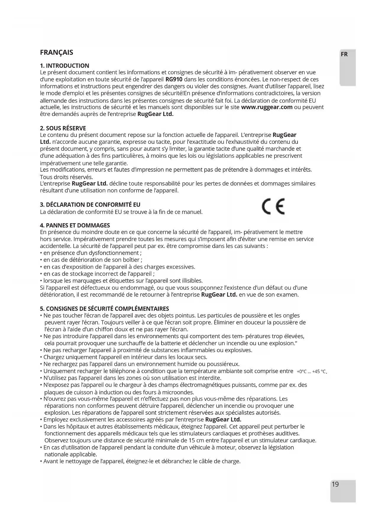 Le présent document contient les informations et consignes de sécurité à im- pérativement observer en vue d’une exploitation en toute sécurité de l’appareil RG910 dans les conditions énoncées. Le non-respect de ces informations et instructions peut engendrer des dangers ou violer des consignes. Avant d’utiliser l’appareil, lisez le mode d’emploi et les présentes consignes de sécurité!En présence d’informations contradictoires, la version allemande des instructions dans les présentes consignes de sécurité fait foi. La déclaration de conformité EU actuelle, les instructions de sécurité et les manuels sont disponibles sur le site www.ruggear.com ou peuvent être demandés auprès de l’entreprise RugGear Ltd.