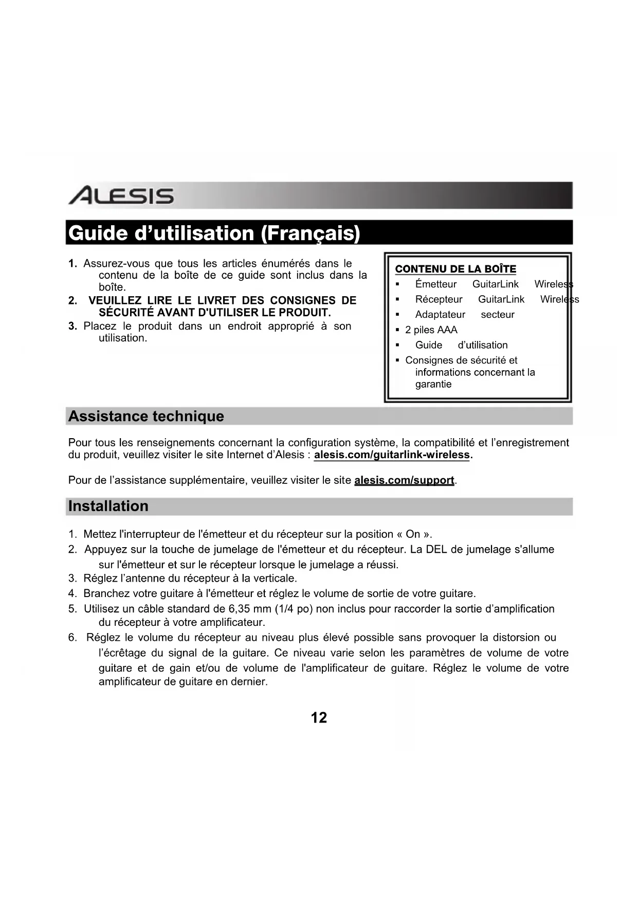Assistance technique Pour tous les renseignements concernant la configuration système, la compatibilité et l’enregistrement du produit, veuillez visiter le site Internet d’Alesis : alesis.com/guitarlink-wireless. Pour de l’assistance supplémentaire, veuillez visiter le site alesis.com/support. Installation