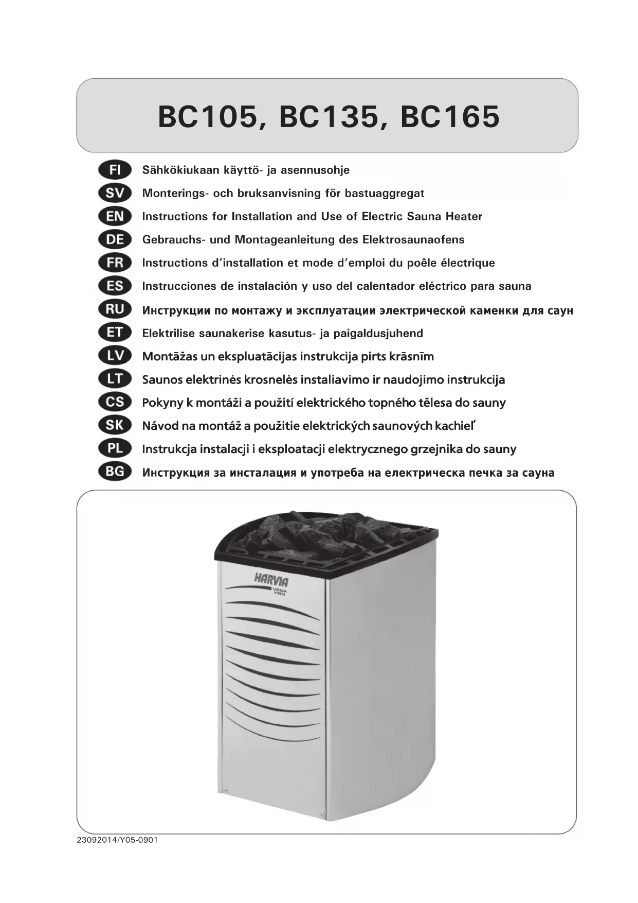 Les poêles BC sont conçus pour chauffer des saunas de grande taille à des températures adaptées pour le sauna. Il est interdit d’utiliser le poêle à d’autres fins. La période de garantie des poêles et de leurs commandes pour les saunas utilisés par des familles est de deux (2) ans. La période de garantie des poêles et de leurs commandes pour les saunas utilisés par des copropriétés est de un (1) an. La période de garantie des poêles et de leurs commandes pour les saunas utilisés par des collectivités est de trois (3) mois. Veuillez lire attentivement le mode d’utilisation avant la mise en service de l’appareil. N.B! Ces instructions d’installation et d’utilisation sont destinées au propriétaire du sauna ou à la personne répondant de l’entretien ainsi qu’à l’électricien réalisant l’installation du poêle. Après l’installation du poêle, remettre ce manuel d’instructions au propriétaire du sauna ou à la personne répondant de l’entretien. Vous avez choisi un poêle Harvia. Nous vous félicitons de votre bon choix! Fin del calentador eléctrico: Los calentadores BC se han diseñado para el calenta- miento de grandes saunas a temperaturas de baño. Se prohibe utilizar el calentador para cualquier otro fin. El periodo de garantía para calentadores y equipos de control utilizados en saunas familiares es de dos (2) años. El periodo de garantía para calentadores y equipos de control utilizados en saunas de edificios residenciales es de un (1) año. El periodo de garantía para calentadores y equipos de control utilizados en saunas de establecimientos es de tres (3) mes. Lea cuidadosamente las instrucciones de uso antes de utilizar el calentador. NOTA: Estas instrucciones de instalación y uso están destinadas al propietario o a la persona a cargo de la sauna, así como al electricista encargado de la instalación eléctrica del calentador. Después de completar la instalación, la persona a cargo de la misma debe entregar estas instrucciones al propietario de la sauna o a la persona encargada de su funcionamiento. ¡Felicidades por su elección!