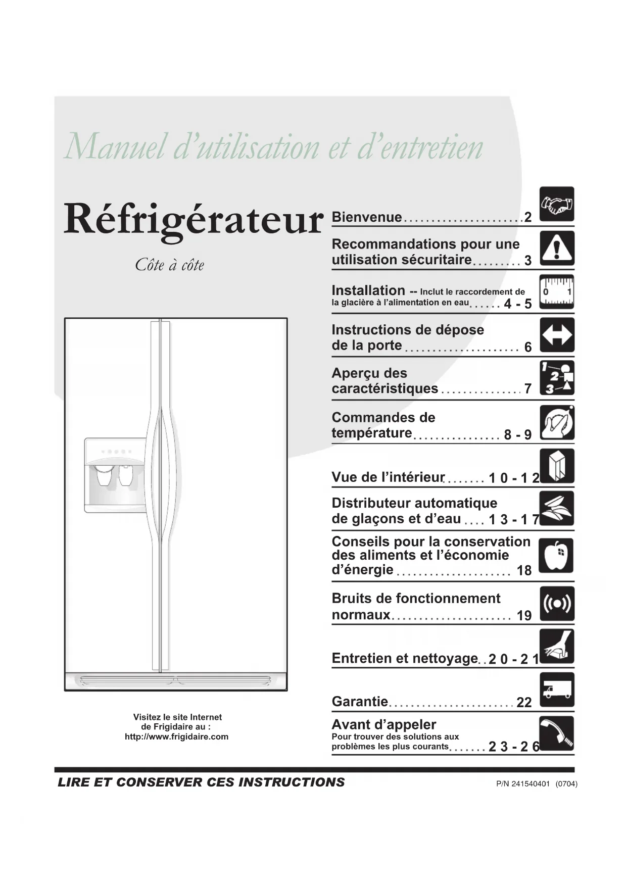 23-26 Recommandations pour uneutilisation sécuritaire Installation -- Inclut le raccordement de la glacière à l’alimentation en eau Instructions de déposede la porteAperçu descaractéristiquesCommandes detempératureVue de l’intérieurDistributeur automatiquede glaçons et d’eauConseils pour la conservationdes aliments et l’économied’énergieEntretien et nettoyageBruits de fonctionnementnormauxGarantieAvant d’appeler Pour trouver des solutions aux problèmes les plus courants Visitez le site Internet de Frigidaire au : http://www.frigidaire.com2 Bienvenue et félicitations Félicitations pour l’achat de votre nouveau réfrigérateur! Nous,de Electrolux Home Products, sommes très fiers de nosproduits et nous sommes déterminés à vous offrir le meilleurservice possible. Votre satisfaction est notre priorité.Veuillez lire attentivement ce manuel d’utilisation etd’entretien. Il contient de précieuses informations sur lameilleure façon d’entretenir votre nouveau réfrigérateur.Nous sommes certains que vous apprécierez votre nouveauréfrigérateur et nous vous remercions d’avoir choisi un denos produits. Nous souhaitons que vous nous soyez fidèlespour vos prochains achats.VEUILLEZ LIRE CES INSTRUCTIONS ET LESCONSERVERCe Manuel d’utilisation et d’entretien fournit des instructionsde fonctionnement spécifiques pour votre modèle. N’utilisezvotre réfrigérateur que de la façon indiquée dans ce manuel.Ces instructions n’ont pas la prétention de couvrir toutes lesconditions ou situations susceptibles de se produire. Il fautfaire preuve de bon sens et de prudence chaque fois quel’on installe un appareil, qu’on le fait fonctionner ou qu’on enfait la maintenance.Veuillez indiquer les numéros de modèle et de série ci-dessous pour référence future. Ces informations setrouvent sur la plaque signalétique située à l’intérieurde votre réfrigérateur.REMARQUE : N’utilisez que de l’eau et du savon pournettoyer la plaque signalétique.Numéro de modèle :Numéro de série :Date de l’achat : Vous avez des questions ? 1-800-944-9044 (États-Unis) 1-866-213-9397 (Canada)ou visitez notre site Internet à : www.frigidaire.comVeuillez attacher les reçus deventes ici pour référence future. Prolongez votre garantie avec un contrat de service prolongé Composez le 1-800-944-9044 pour bénéficier des avantages suivants :