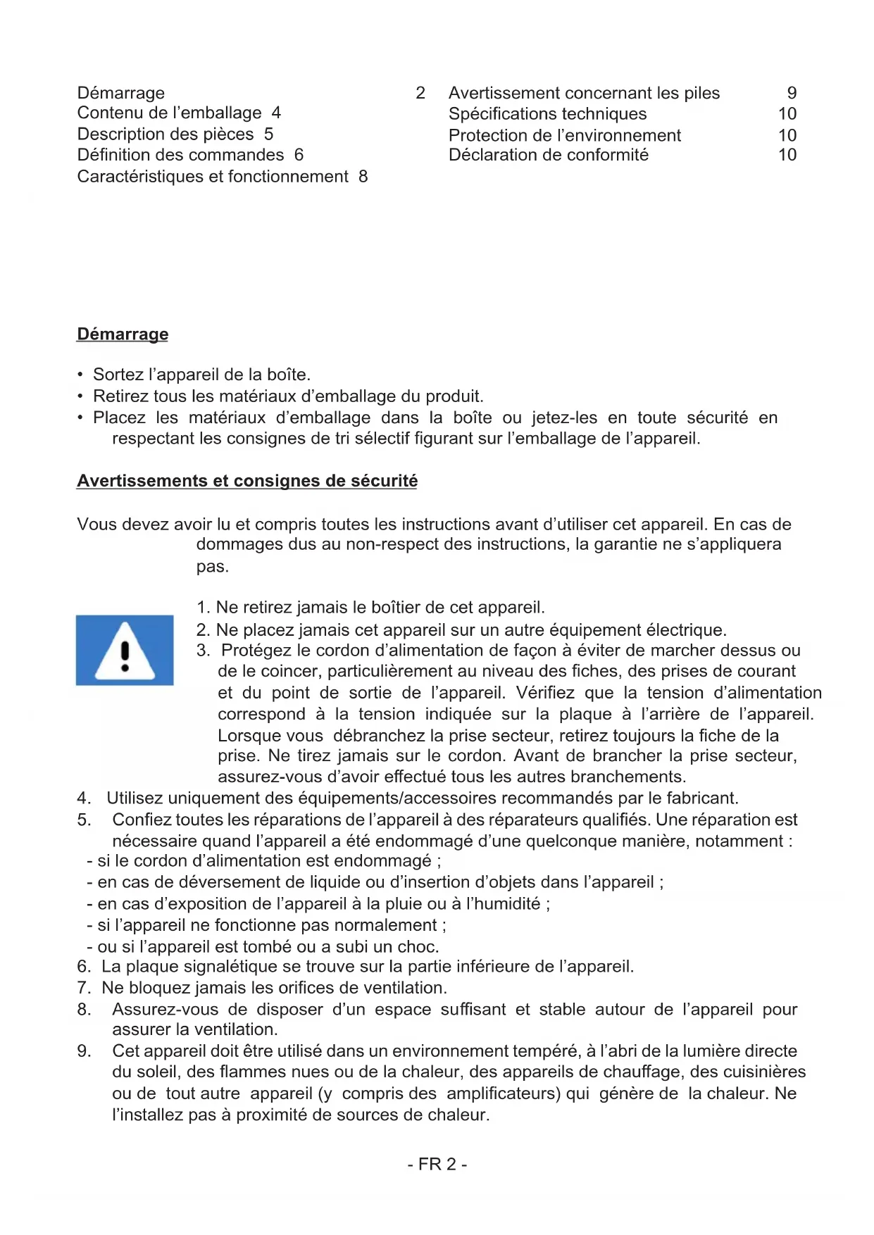 du soleil, des ammes nues ou de la chaleur, des appareils de chauage, des cuisinières ou de tout autre appareil (y compris des amplicateurs) qui génère de la chaleur. Ne l’inallez pas à proximité de sources de chaleur. Démarrage 2 Contenu de l’emballage 4 Description des pièces 5 Dénition des commandes 6 Caractériiques et fonctionnement 8 Avertissement concernant les piles 9 Spécications techniques 10 Protection de l’environnement 10 Déclaration de conformité 10- FR 3 -