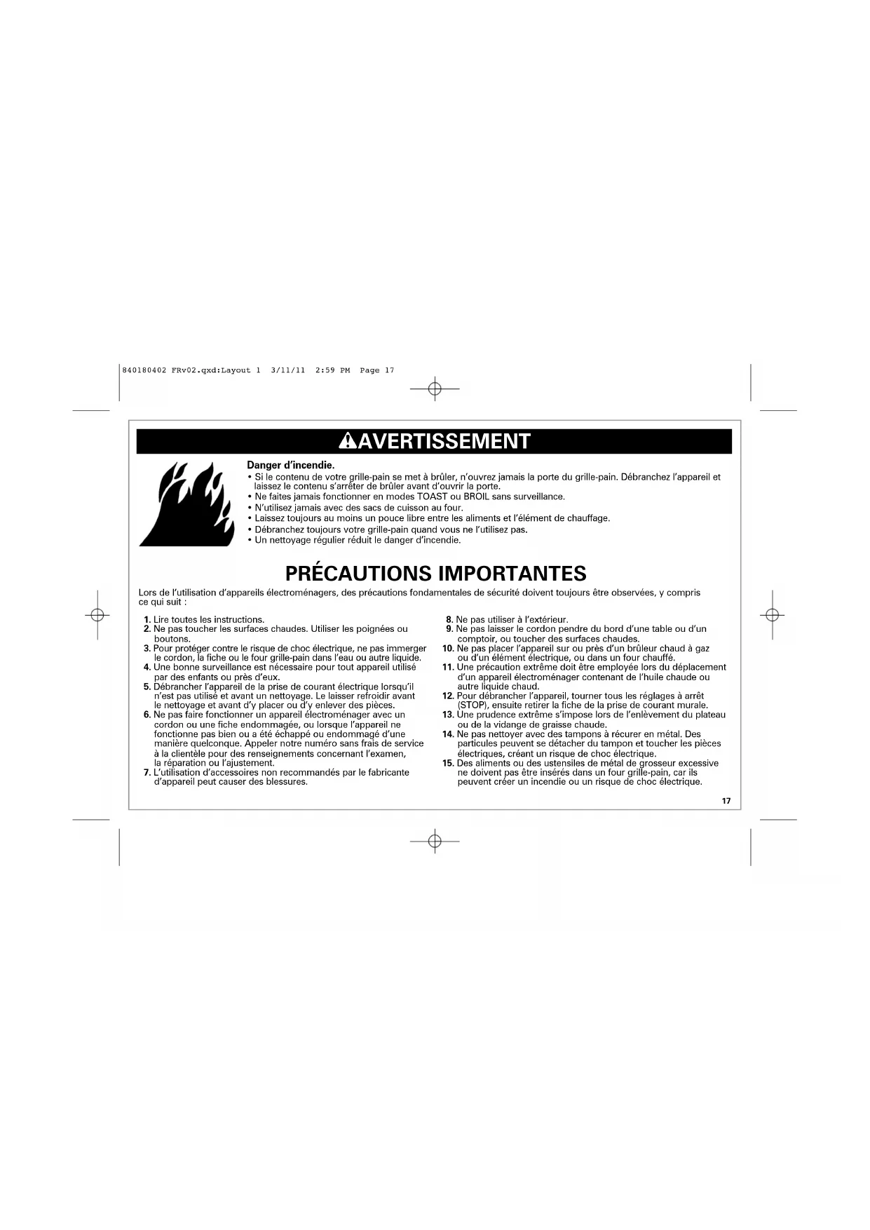 - Un nettoyage régulier réduit le danger d’incendie. 840180402 FRv02.qxd:Layout 1 3/11/11 2:59 PM Page 1718 CONSERVER CES INSTRUCTIONS !