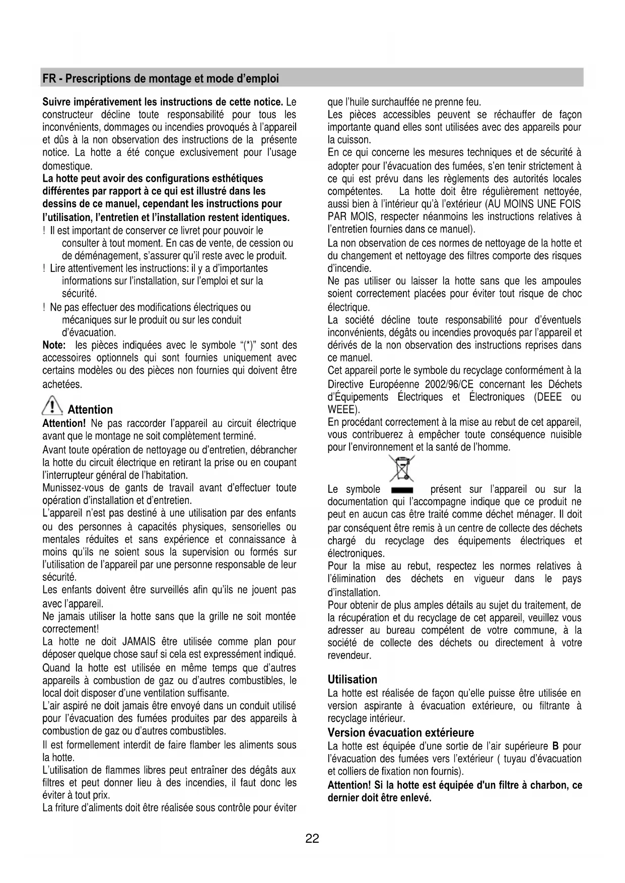 If the lights do not work, make sure that the lamps are fitted properly into their housings before you call for technical assistance.22 FR - Prescriptions de montage et mode d’emploi Suivre impérativement les instructions de cette notice. Le constructeur décline toute responsabilité pour tous les inconvénients, dommages ou incendies provoqués à l’appareil et dûs à la non observation des instructions de la présente notice. La hotte a été conçue exclusivement pour l’usage domestique. La hotte peut avoir des configurations esthétiques différentes par rapport à ce qui est illustré dans les dessins de ce manuel, cependant les instructions pour l’utilisation, l’entretien et l’installation restent identiques. ! Il est important de conserver ce livret pour pouvoir le consulter à tout moment. En cas de vente, de cession ou de déménagement, s’assurer qu’il reste avec le produit. ! Lire attentivement les instructions: il y a d’importantes informations sur l’installation, sur l’emploi et sur la sécurité. ! Ne pas effectuer des modifications électriques ou mécaniques sur le produit ou sur les conduit d’évacuation. Note: les pièces indiquées avec le symbole “(*)” sont des accessoires optionnels qui sont fournies uniquement avec certains modèles ou des pièces non fournies qui doivent être achetées. Attention Attention! Ne pas raccorder l’appareil au circuit électrique avant que le montage ne soit complètement terminé. Avant toute opération de nettoyage ou d’entretien, débrancher la hotte du circuit électrique en retirant la prise ou en coupant l’interrupteur général de l’habitation. Munissez-vous de gants de travail avant d’effectuer toute opération d’installation et d’entretien. L’appareil n’est pas destiné à une utilisation par des enfants ou des personnes à capacités physiques, sensorielles ou mentales réduites et sans expérience et connaissance à moins qu’ils ne soient sous la supervision ou formés sur l’utilisation de l’appareil par une personne responsable de leur sécurité. Les enfants doivent être surveillés afin qu’ils ne jouent pas avec l’appareil. Ne jamais utiliser la hotte sans que la grille ne soit montée correctement! La hotte ne doit JAMAIS être utilisée comme plan pour déposer quelque chose sauf si cela est expressément indiqué. Quand la hotte est utilisée en même temps que d’autres appareils à combustion de gaz ou d’autres combustibles, le local doit disposer d’une ventilation suffisante. L’air aspiré ne doit jamais être envoyé dans un conduit utilisé pour l’évacuation des fumées produites par des appareils à combustion de gaz ou d’autres combustibles. Il est formellement interdit de faire flamber les aliments sous la hotte. L’utilisation de flammes libres peut entraîner des dégâts aux filtres et peut donner lieu à des incendies, il faut donc les éviter à tout prix. La friture d’aliments doit être réalisée sous contrôle pour éviter que l’huile surchauffée ne prenne feu. Les pièces accessibles peuvent se réchauffer de façon importante quand elles sont utilisées avec des appareils pour la cuisson. En ce qui concerne les mesures techniques et de sécurité à adopter pour l’évacuation des fumées, s’en tenir strictement à ce qui est prévu dans les règlements des autorités locales compétentes. La hotte doit être régulièrement nettoyée, aussi bien à l’intérieur qu’à l’extérieur (AU MOINS UNE FOIS PAR MOIS, respecter néanmoins les instructions relatives à l’entretien fournies dans ce manuel). La non observation de ces normes de nettoyage de la hotte et du changement et nettoyage des filtres comporte des risques d’incendie. Ne pas utiliser ou laisser la hotte sans que les ampoules soient correctement placées pour éviter tout risque de choc électrique. La société décline toute responsabilité pour d’éventuels inconvénients, dégâts ou incendies provoqués par l’appareil et dérivés de la non observation des instructions reprises dans ce manuel. Cet appareil porte le symbole du recyclage conformément à la Directive Européenne 2002/96/CE concernant les Déchets d’Équipements Électriques et Électroniques (DEEE ou WEEE). En procédant correctement à la mise au rebut de cet appareil, vous contribuerez à empêcher toute conséquence nuisible pour l’environnement et la santé de l’homme. Le symbole présent sur l’appareil ou sur la documentation qui l’accompagne indique que ce produit ne peut en aucun cas être traité comme déchet ménager. Il doit par conséquent être remis à un centre de collecte des déchets chargé du recyclage des équipements électriques et électroniques. Pour la mise au rebut, respectez les normes relatives à l’élimination des déchets en vigueur dans le pays d’installation. Pour obtenir de plus amples détails au sujet du traitement, de la récupération et du recyclage de cet appareil, veuillez vous adresser au bureau compétent de votre commune, à la société de collecte des déchets ou directement à votre revendeur. Utilisation La hotte est réalisée de façon qu’elle puisse être utilisée en version aspirante à évacuation extérieure, ou filtrante à recyclage intérieur. Version évacuation extérieure La hotte est équipée d’une sortie de l’air supérieure B pour l’évacuation des fumées vers l’extérieur ( tuyau d’évacuation et colliers de fixation non fournis). Attention! Si la hotte est équipée d'un filtre à charbon, ce dernier doit être enlevé.23 Version recyclage Dans l’éventualité où il ne serait pas possible d’évacuer les fumées et les vapeurs de cuisson vers l’extérieur, il est possible d’utiliser la hotte dans la version recylcage, en effectuant le montage d’un filtre à charbon actif et d’un déflecteur F sur le support (bride) G. Les fumées et les vapeurs sont recyclées à travers le gr