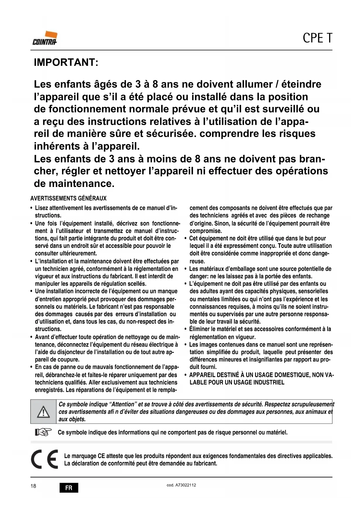 CPE T cod. A73022112• Lisez attentivement les avertissements de ce manuel d’in- structions.