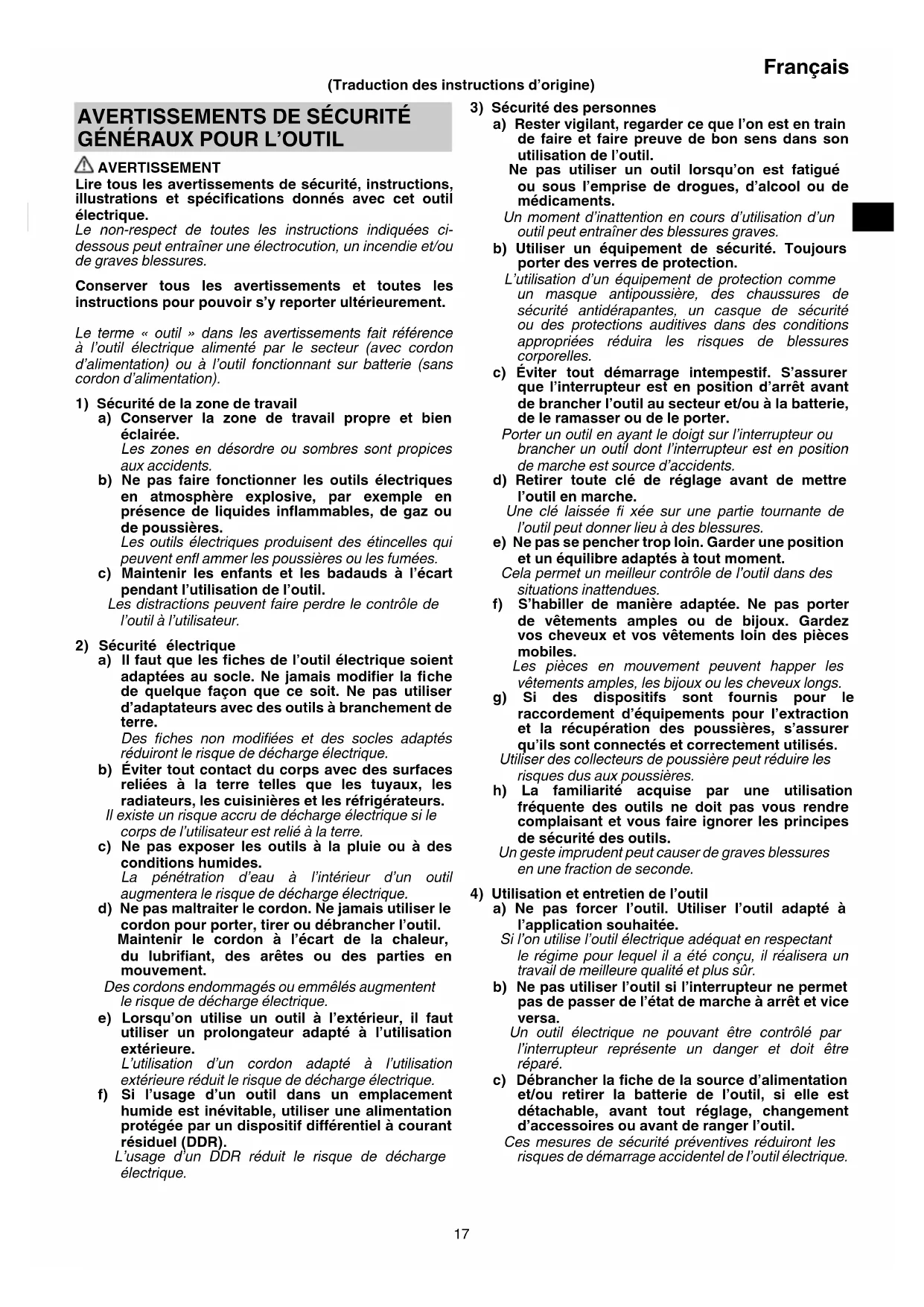 AVERTISSEMENT Lire tous les avertissements de sécurité, instructions, illustrations et spécifi cations donnés avec cet outil électrique. Le non-respect de toutes les instructions indiquées ci- dessous peut entraîner une électrocution, un incendie et/ou de graves blessures. Conserver tous les avertissements et toutes les instructions pour pouvoir s’y reporter ultérieurement. Le terme « outil » dans les avertissements fait référence à l’outil électrique alimenté par le secteur (avec cordon d’alimentation) ou à l’outil fonctionnant sur batterie (sans cordon d’alimentation).