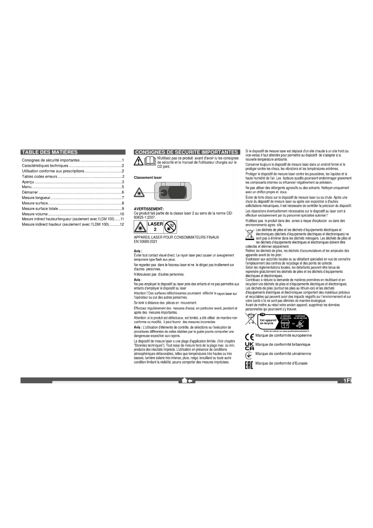 Ne pas employer le dispositif au laser près des enfants et ne pas permettre aux enfants d'employer le dispositif au laser Attention ! Des surfaces rééchissantes pourraient rééchir le rayon laser sur l'opérateur ou sur des autres personnes. Se tenir à distance des pièces en mouvement. Eectuez régulièrement des mesures d'essai, en particulier ava nt, pendant et après des mesures importantes. Attention: si le produit est défectueux, est tombé, a été utilisé de manière non conforme ou modié, il peut fournir des mesures incorrectes Avis : L'utilisation d'éléments de contrôle, de sélections ou l'exécution de procédures diérentes de celles établies par le guide pourra comporter une dangereuse exposition aux rayons. Le dispositif de mesure laser a une plage d'application limitée. (Voir chapitre "Données techniques"). Tout essai de mesure hors de la plage max. ou min. produira des résultats imprécis. L'utilisation en présence de conditions atmosphériques défavorables, telles que températures très hautes ou très basses, lumière solaire très intense, pluie, neige, brouillard ou toute autre condition limitant la visibilité, pourra comporter des mesures imprécises. Si le dispositif de mesure laser est déplacé d'un site chaude à un site froid (ou vice-versa) il faut attendre pour permettre au dispositif de s'adapter à la nouvelle température ambiante. Conserver toujours le dispositif de mesure laser dans un endroit fermé et le protéger contre les chocs, les vibrations et les températures extrêmes. Protéger le dispositif de mesure laser contre les poussières, les liquides et la haute humidité de l'air. Les facteurs susdits pourraient endommager gravement les composants internes ou inuencer négativement sa précision. Ne pas utiliser des détergents agressifs ou des solvants. Nettoyer uniquement avec un chion propre et doux. Éviter de forts chocs sur le dispositif de mesure laser ou sa chute. Après une chute du dispositif de mesure laser ou après son exposition à d'autres sollicitations mécaniques, il est nécessaire de contrôler la précision du dispositif. Les réparations éventuellement nécessaires sur le dispositif au laser sont à eectuer exclusivement par du personnel spécialisé autorisé ! N'utilisez pas le produit dans des zones à risque d'explosion ou dans des environnements agres- sifs. Les déchets de piles et les déchets d’équipements électriques et électroniques (déchets d’équipements électriques et électroniques) ne sont pas à éliminer dans les déchets ménagers. Les déchets de piles et les déchets d’équipements électriques et électroniques doivent être collectés et éliminer séparément. Retirez les déchets de piles, les déchets d’accumulateurs et les ampoules des appareils avant de les jeter