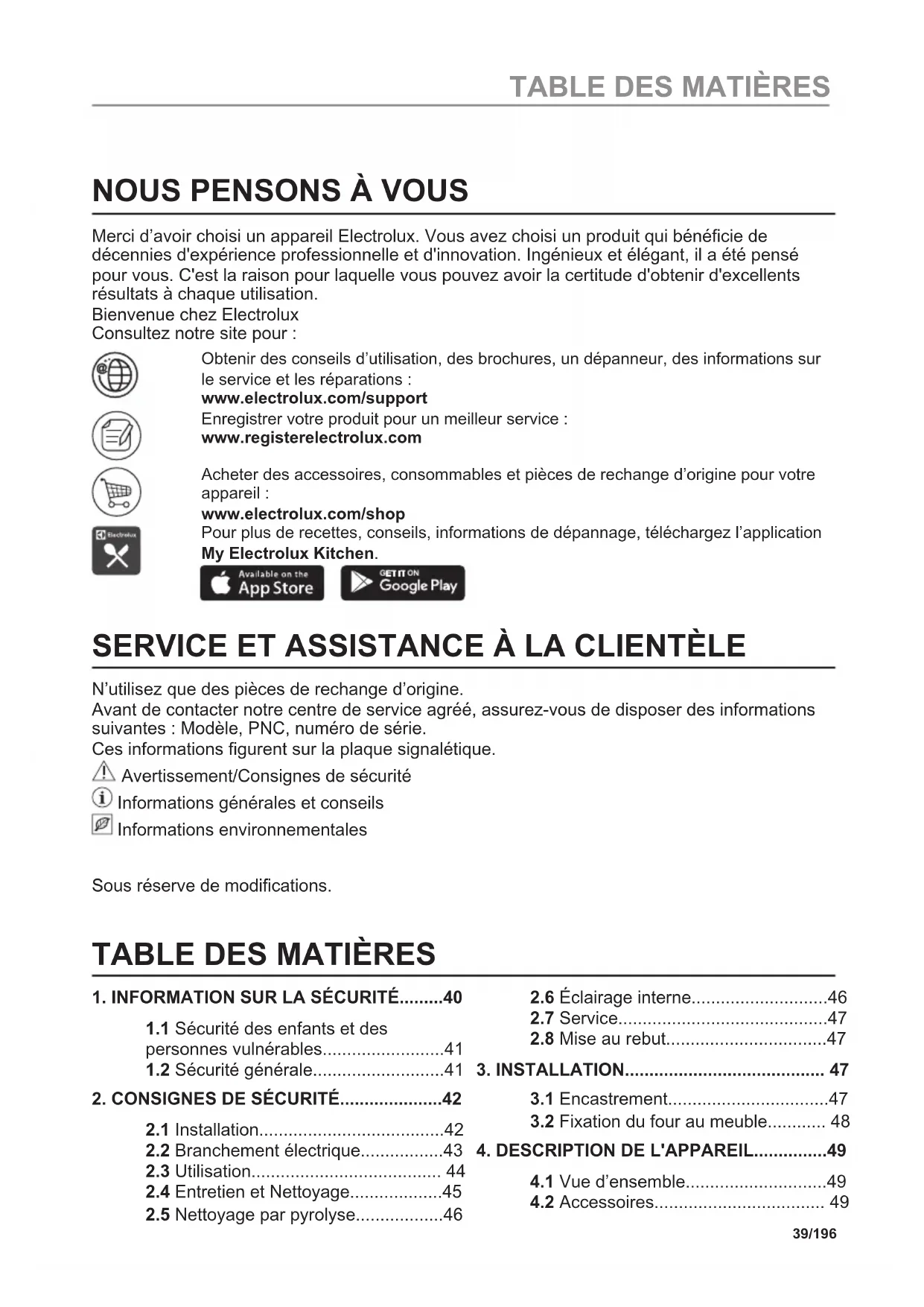 Merci d’avoir choisi un appareil Electrolux. Vous avez choisi un produit qui bénéficie de décennies d'expérience professionnelle et d'innovation. Ingénieux et élégant, il a été pensé pour vous. C'est la raison pour laquelle vous pouvez avoir la certitude d'obtenir d'excellents résultats à chaque utilisation. Bienvenue chez Electrolux Consultez notre site pour : Obtenir des conseils d’utilisation, des brochures, un dépanneur, des informations sur le service et les réparations : www.electrolux.com/support Enregistrer votre produit pour un meilleur service : www.registerelectrolux.com Acheter des accessoires, consommables et pièces de rechange d’origine pour votre appareil : www.electrolux.com/shop Pour plus de recettes, conseils, informations de dépannage, téléchargez l’application My Electrolux Kitchen.