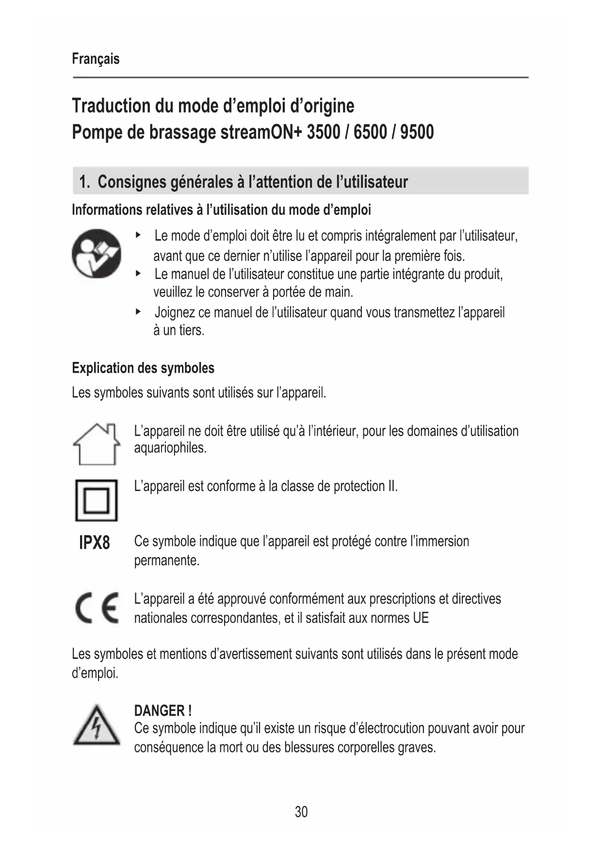 Informations relatives à l’utilisation du mode d’emploi ▶ Le mode d’emploi doit être lu et compris intégralement par l’utilisateur, avant que ce dernier n’utilise l’appareil pour la première fois. ▶ Le manuel de l’utilisateur constitue une partie intégrante du produit, veuillez le conserver à portée de main. ▶ Joignez ce manuel de l’utilisateur quand vous transmettez l’appareil à un tiers. Explication des symboles Les symboles suivants sont utilisés sur l’appareil. L’appareil ne doit être utilisé qu’à l’intérieur, pour les domaines d’utilisation aquariophiles. L’appareil est conforme à la classe de protection II. Ce symbole indique que l’appareil est protégé contre l’immersion permanente. L’appareil a été approuvé conformément aux prescriptions et directives nationales correspondantes, et il satisfait aux normes UE Les symboles et mentions d’avertissement suivants sont utilisés dans le présent mode d’emploi. DANGER ! Ce symbole indique qu’il existe un risque d’électrocution pouvant avoir pour conséquence la mort ou des blessures corporelles graves. IPX8Français