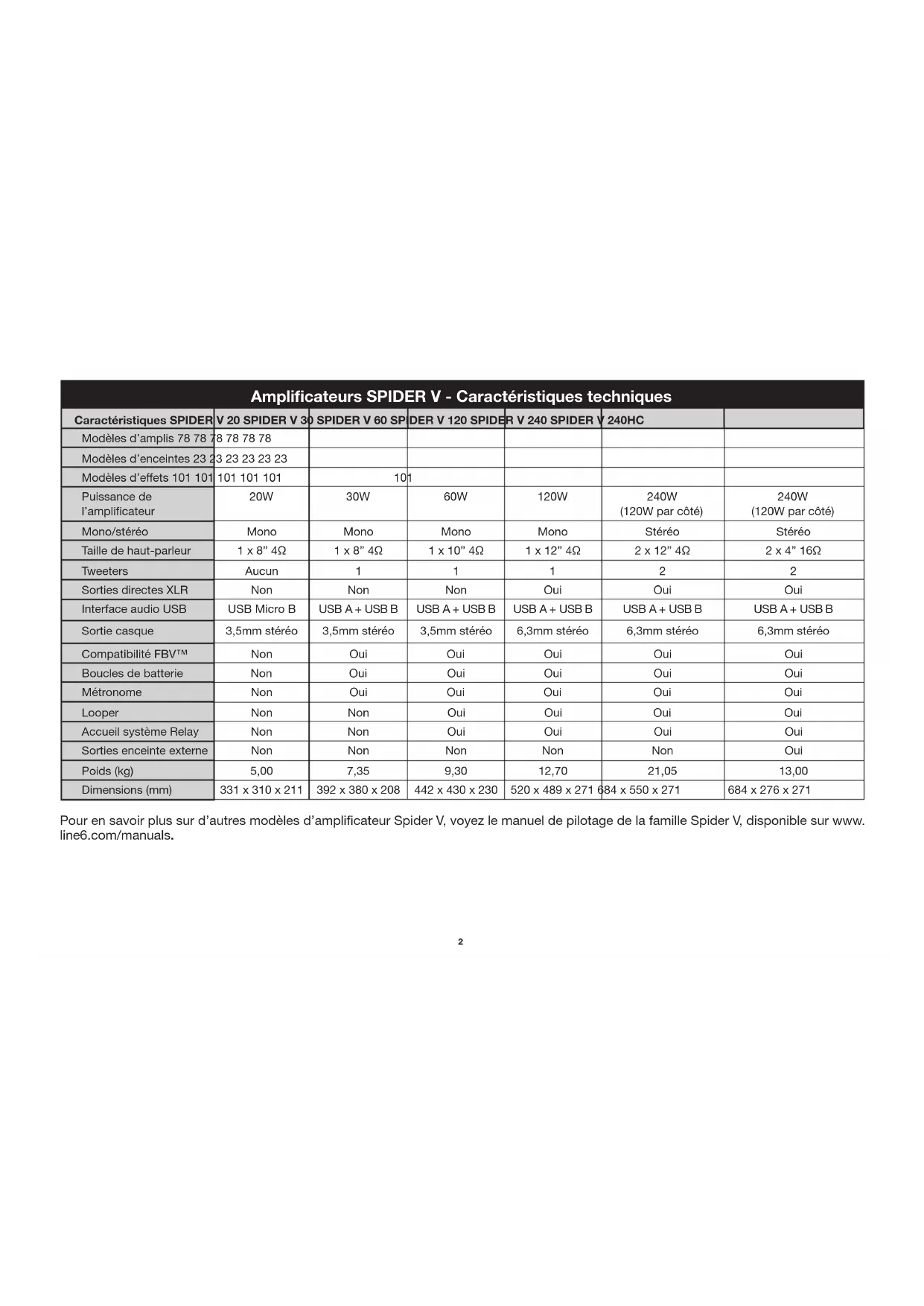 SPIDER V 20 Manuel de pilotage 40-00-0395 Version A www.line6.com/manuals © 2017 Line 6, Inc.2 Amplicateurs SPIDER V - Caractéristiques techniques Caractéristiques SPIDER V 20 SPIDER V 30 SPIDER V 60 SPIDER V 120 SPIDER V 240 SPIDER V 240HC Modèles d’amplis 78 78 78 78 78 78 Modèles d’enceintes 23 23 23 23 23 23 Modèles d’eets 101 101 101 101 101 101 Puissance de l’amplicateur 20W 30W 60W 120W 240W (120W par côté) 240W (120W par côté) Mono/stéréo Mono Mono Mono Mono Stéréo Stéréo Taille de haut-parleur 1 x 8” 4Ω 1 x 8” 4Ω 1 x 10” 4Ω 1 x 12” 4Ω 2 x 12” 4Ω 2 x 4” 16Ω Tweeters Aucun 1 1 1 2 2 Sorties directes XLR Non Non Non Oui Oui Oui Interface audio USB USB Micro B USB A + USB B USB A + USB B USB A + USB B USB A + USB B USB A + USB B Sortie casque 3,5mm stéréo 3,5mm stéréo 3,5mm stéréo 6,3mm stéréo 6,3mm stéréo 6,3mm stéréo Compatibilité FBV™ Non Oui Oui Oui Oui Oui Boucles de batterie Non Oui Oui Oui Oui Oui Métronome Non Oui Oui Oui Oui Oui Looper Non Non Oui Oui Oui Oui Accueil système Relay Non Non Oui Oui Oui Oui Sorties enceinte externe Non Non Non Non Non Oui Poids (kg) 5,00 7,35 9,30 12,70 21,05 13,00 Dimensions (mm) 331 x 310 x 211 392 x 380 x 208 442 x 430 x 230 520 x 489 x 271 684 x 550 x 271 684 x 276 x 271 Pour en savoir plus sur d’autres modèles d’amplicateur Spider V, voyez le manuel de pilotage de la famille Spider V, disponible sur www. line6.com/manuals.3 Présentation Bienvenue au manuel de pilotage du SPIDER V 20. Ce manuel décrit les caractéristiques et le fonctionnement de l’amplicateur Line 6