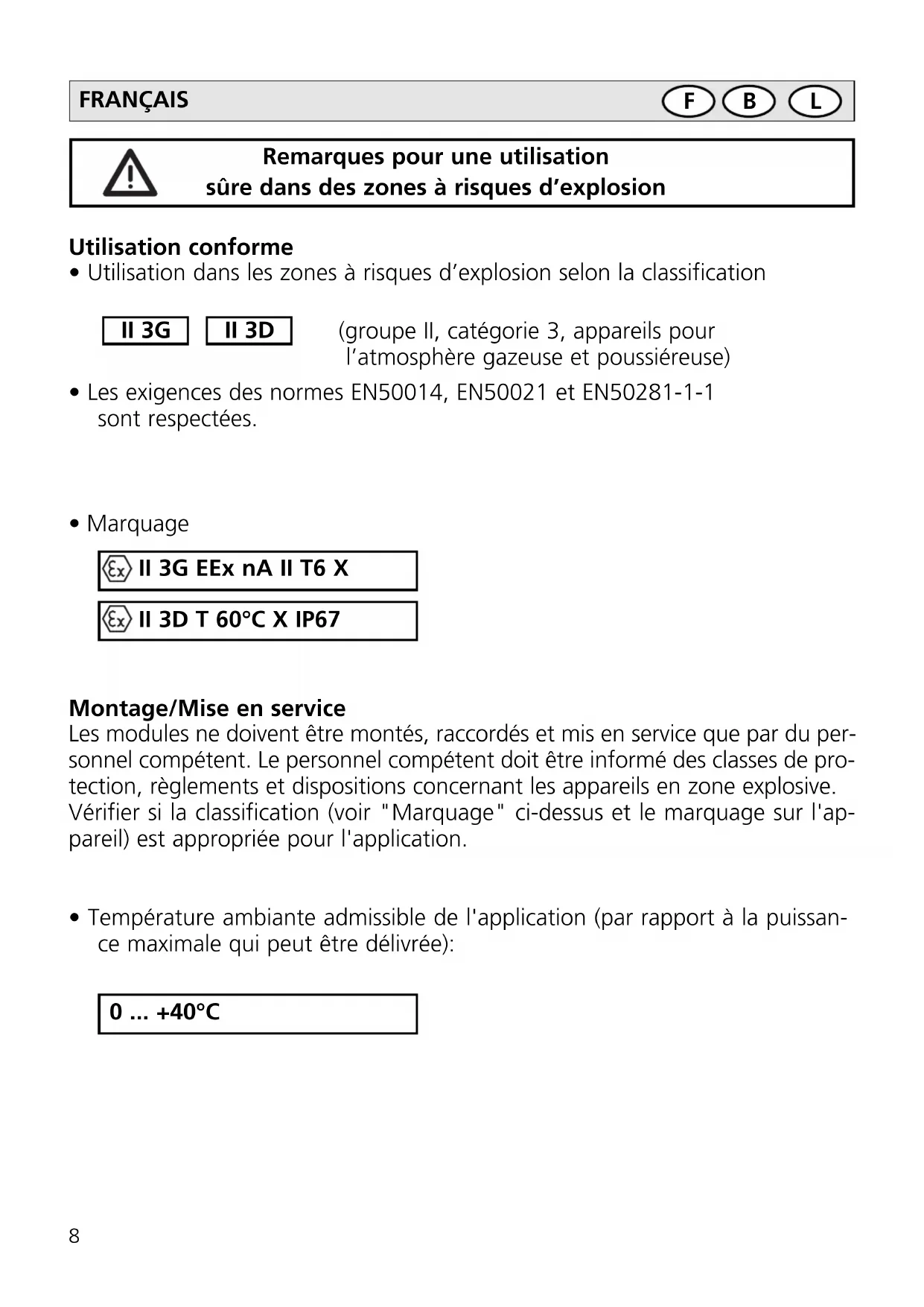 LBF FRANÇAIS II 3G II 3G EEx nA II T6 X Remarques pour une utilisation sûre dans des zones à risques d’explosion II 3D II 3D T 60°C X IP67 0 ... +40°CConsignes d'installation /Montage