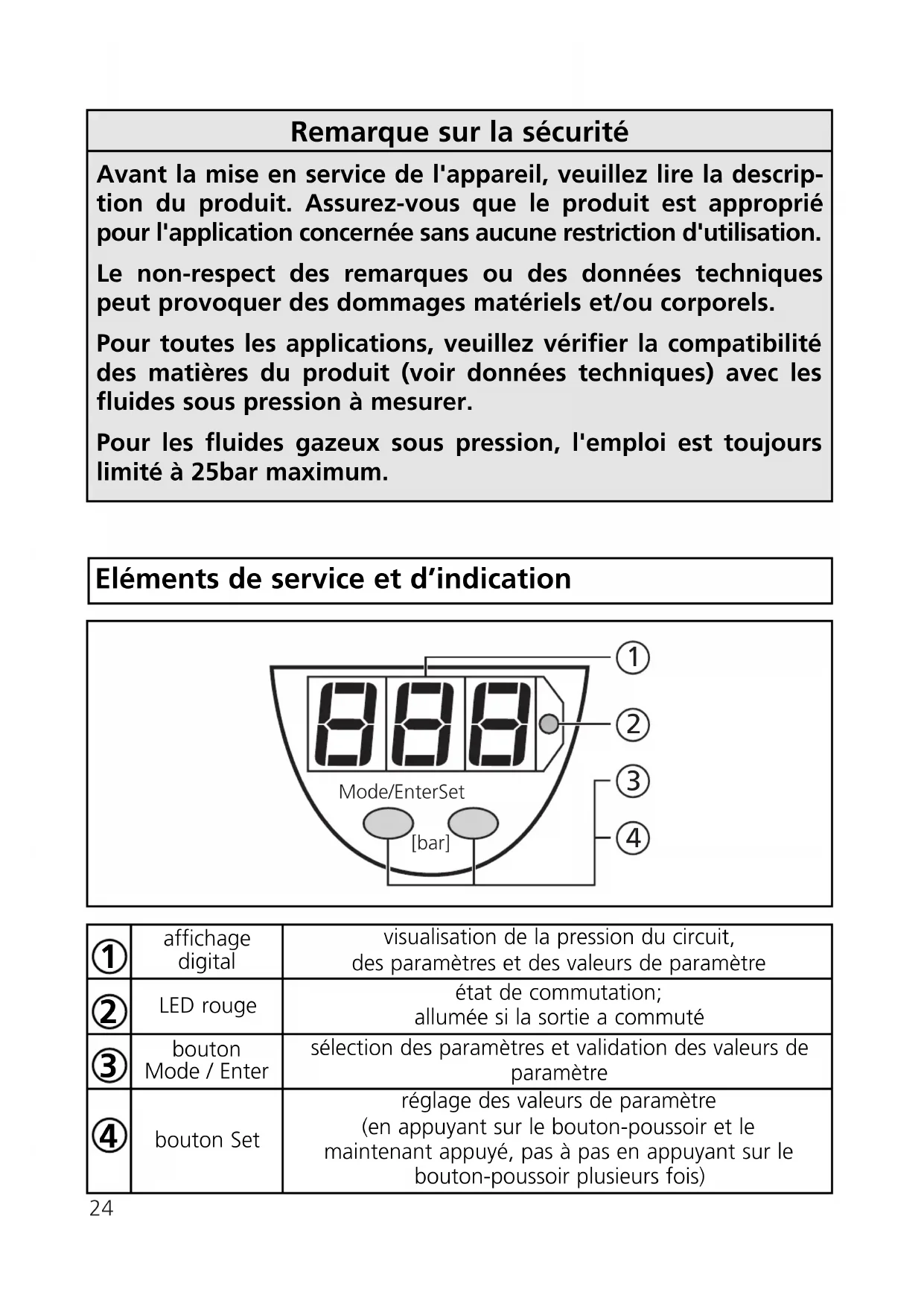 IEC 1000/4/3 HF radiated:. . . . . . . . . . . . . . . . . . . . . . . . . . . . . . . . 10 V/m IEC 1000/4/4 Burst: . . . . . . . . . . . . . . . . . . . . . . . . . . . . . . . . . . . . . . 2 KV IEC 1000/4/6 HF conducted: . . . . . . . . . . . . . . . . . . . . . . . . . . . . . . . . 10 V *Increased protection (IP 67) with accessories (Order no. E30038).24 Eléments de service et d’indication affichage digital visualisation de la pression du circuit, des paramètres et des valeurs de paramètre LED rouge état de commutation; allumée si la sortie a commuté bouton Mode / Enter sélection des paramètres et validation des valeurs de paramètre bouton Set réglage des valeurs de paramètre (en appuyant sur le bouton-poussoir et le maintenant appuyé, pas à pas en appuyant sur le bouton-poussoir plusieurs fois)