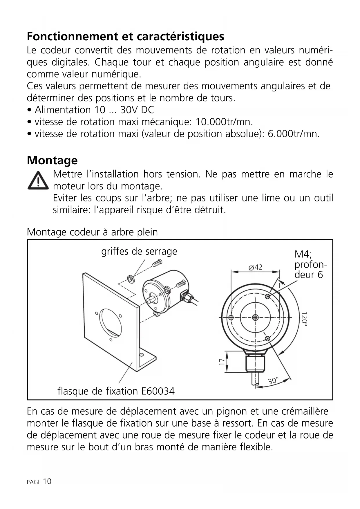 - vitesse de rotation maxi (valeur de position absolue): 6.000tr/mn. Montage Mettre l’installation hors tension. Ne pas mettre en marche le moteur lors du montage. Eviter les coups sur l’arbre; ne pas utiliser une lime ou un outil similaire: l’appareil risque d’être détruit. Montage codeur à arbre plein En cas de mesure de déplacement avec un pignon et une crémaillère monter le flasque de fixation sur une base à ressort. En cas de mesure de déplacement avec une roue de mesure fixer le codeur et la roue de mesure sur le bout d’un bras monté de manière flexible. PAGE 10