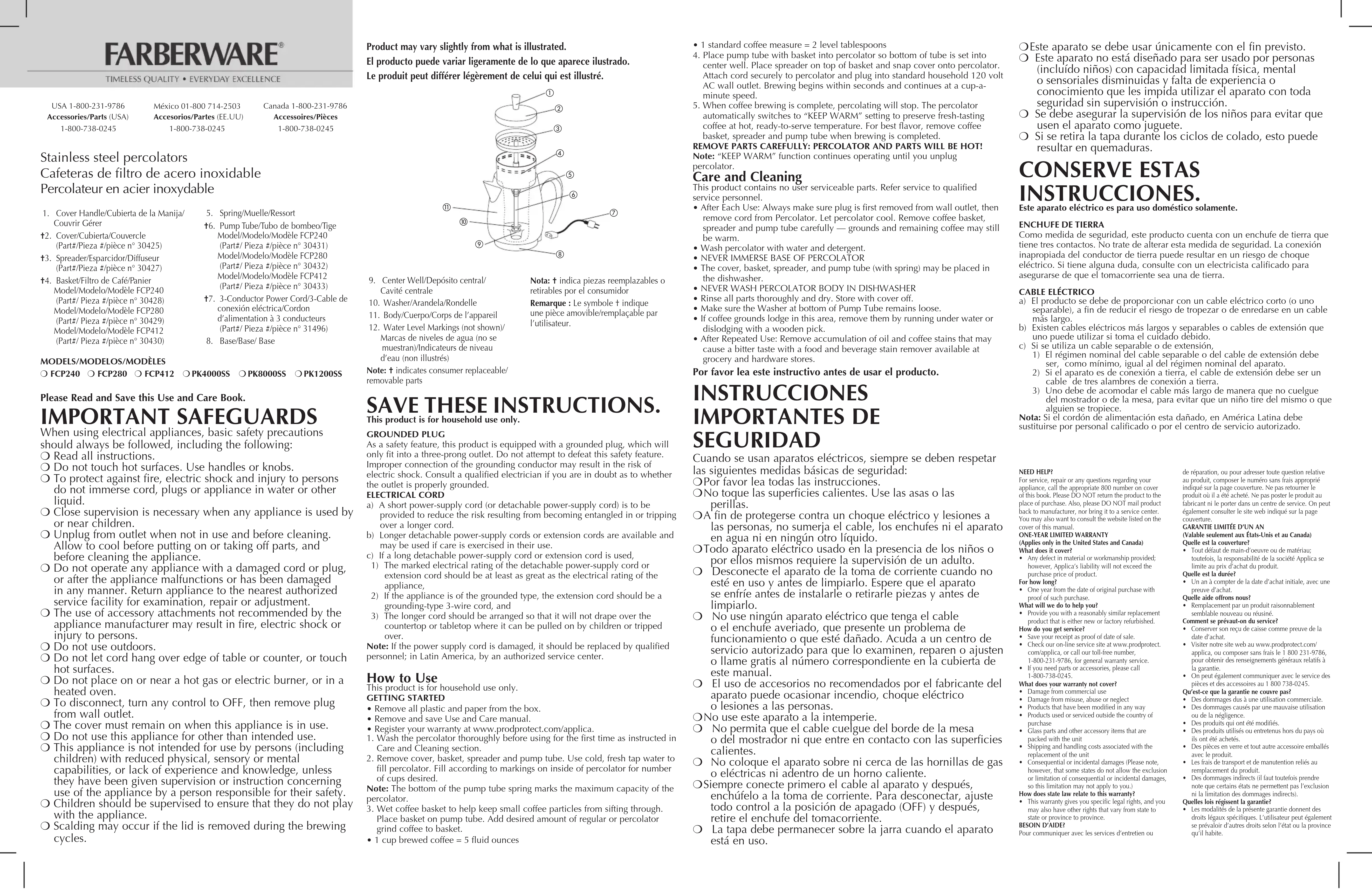 CouvrirGérer †2. Cover/Cubierta/Couvercle (Part#/Pieza#/piècen°30425) †3. Spreader/Esparcidor/Diffuseur (Part#/Pieza#/piècen°30427) † 4. Basket/FiltrodeCafé/Panier Model/Modelo/ModèleFCP240 (Part#/Pieza#/piècen°30428) Model/Modelo/ModèleFCP280 (Part#/Pieza#/piècen°30429) Model/Modelo/ModèleFCP412 (Part#/Pieza#/piècen°30430)