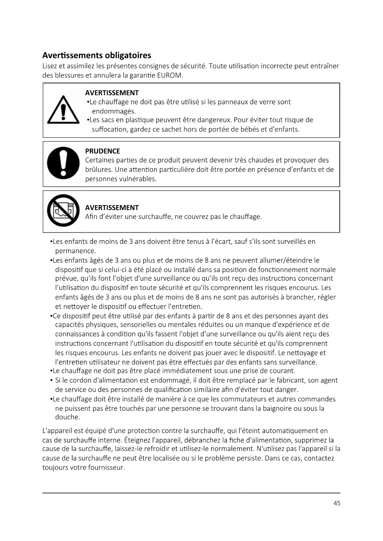 - Les sacs en plasque peuvent être dangereux. Pour éviter tout risque de suocaon, gardez ce sachet hors de portée de bébés et d'enfants. PRUDENCE Certaines pares de ce produit peuvent devenir très chaudes et provoquer des brûlures. Une aenon parculière doit être portée en présence d’enfants et de personnes vulnérables. AVERTISSEMENT An d’éviter une surchaue, ne couvrez pas le chauage.