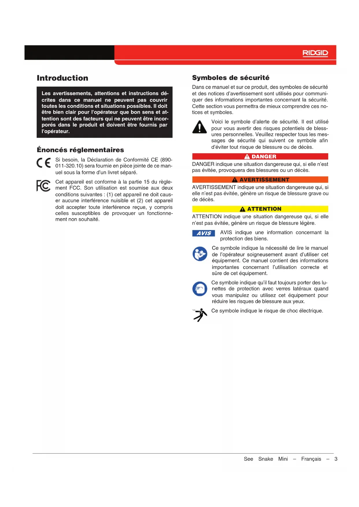 - Contact Ridge Tool Company Technical Service De- partment at rtctechservices@emerson.com or, in the USA and Canada, call 1-800-519-3456. Disposal Parts of your system contain valuable materials that can be recycled. There are companies that specialize in recy- cling that may be found locally. Dispose of the components in compliance with all applicable regulations. Contact your local waste management authority for more information. EC Countries: Do not dispose of electrical equipment with household waste! According to the European Guideline 2012/19/ EU for Waste Electrical and Electronic Equip- ment and its implementation into national legisla- tion, electrical equipment that is no longer usable must be collected separately and disposed of in an environmentally correct manner. Battery Disposal EC Countries: Defective or used batteries must be recy- cled according to the guideline 2006/66/EEC.See Snake Mini – English – 11Manuel de l'opérateur AVERTISSEMENT ! Lire soigneusement ce Ma- nuel de l'opérateur avant d'utiliser cet appareil. Un manque de compréhension et un manque de respect du contenu de ce manuel peuvent causer un choc électrique, un incendie et/ou des blessures graves. Pour des informations supplémen- taires sur See Snake Mini, visitez support.seesnake.com/fr/mini ou scannez ce code QR. Traduction des instructions d’origine – Français – 1 MINI Avec Technologie2 – Français – See Snake Mini Table des matières Introduction Énoncés réglementaires .........................................................................................................................................3 Symboles de sécurité .............................................................................................................................................3 Règles générales de sécurité Sécurité de l’aire de travail ......................................................................................................................................4 Sécurité électrique ..................................................................................................................................................4 Sécurité personnelle ............................................................................................................................................... 4 Utilisation et entretien de l’équipement .....................................................................................................................5 Contrôle préalable ..................................................................................................................................................5 Vue d’ensemble du See Snake Mini Description ............................................................................................................................................................6 Caractéristiques techniques ....................................................................................................................................7 Équipement Standard .............................................................................................................................................7 Composantes du système .......................................................................................................................................8 Informations de sécurité spécifiques Sécurité See Snake Mini ..........................................................................................................................................8 Consignes d'utilisation Positionnement ......................................................................................................................................................9 Vue d'ensemble de l'inspection ................................................................................................................................9 Guides de canalisation ............................................................................................................................................9 Maintenance et assistance Nettoyage ............................................................................................................................................................10 Maintenance des pièces .......................................................................................................................................10 Stockage .............................................................................................................................................................10 Assistance ...........................................................................................................................................................10 Entretien et réparation ..........................................................................................................................................10 Mise au rebut .......................................................................................................................................................10See Snake Mini – Français – 3 Introduction Les avertissements, attentions et instructions dé- crites dans ce manuel ne peuvent pas couvrir toutes les conditions et situations possibles. Il doit être bien clair pour l'opérateur que bon sens et at- tention sont des facteurs qui ne peuvent être incor- porés dans le produit et doivent être fournis par l'opérateur. Énoncés réglementaires Si besoin, la Déclaration de Conformité CE (890- 011-320.10) sera fournie en pièce jointe de ce man- uel sous la forme d’un livret séparé. Cet appareil est conforme à la partie 15 du règle- ment FCC. Son utilisation est soumise aux deux conditions suivantes: (1) cet appareil ne doit caus- er aucune interférence nuisible et (2) cet appareil doit accepter toute interférence reçue, y compris celles susceptibles de provoquer un fonctionne- ment non souhaité