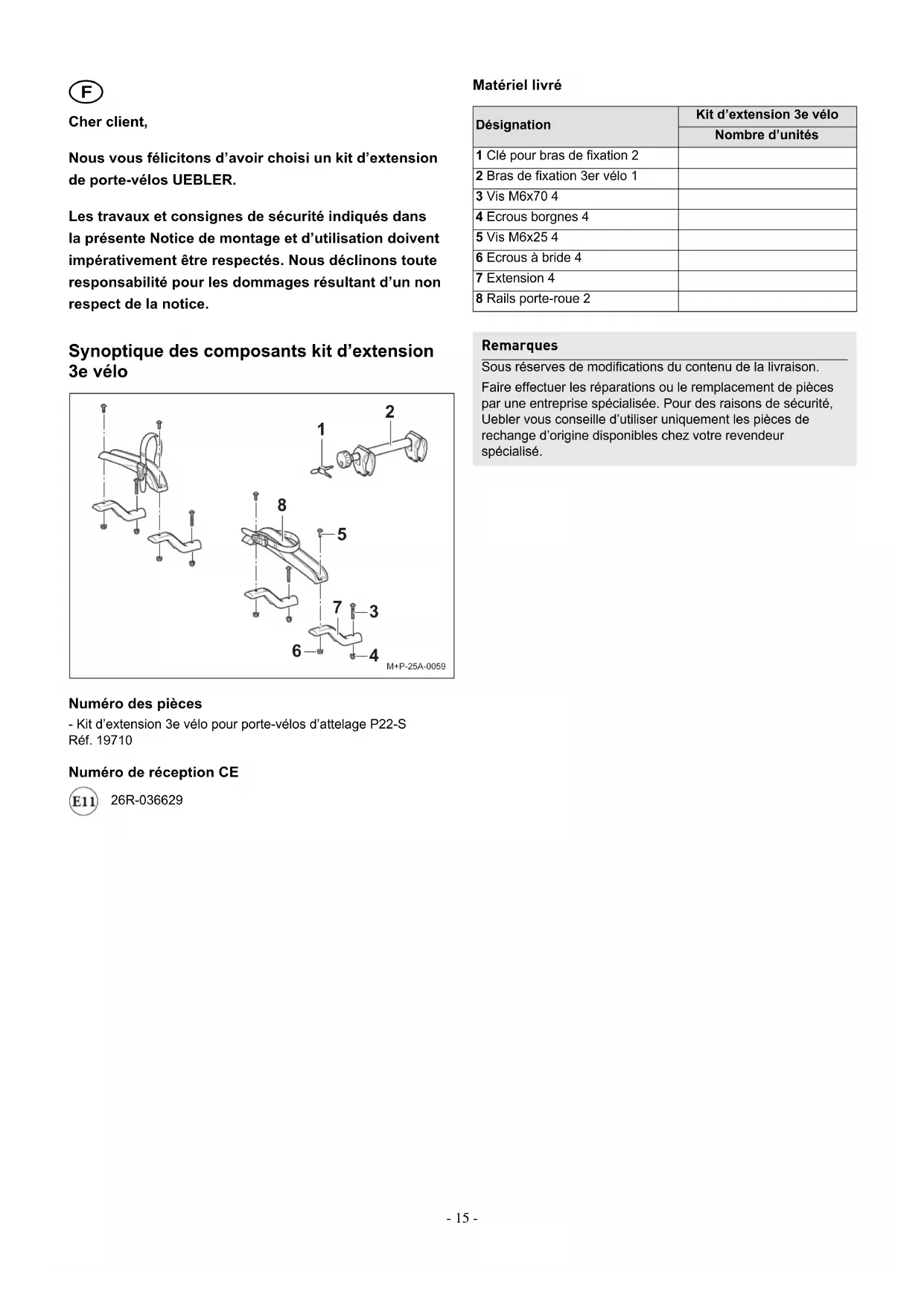 Cher client, Nous vous félicitons d’avoir choisi un kit d’extension de porte-vélos UEBLER. Les travaux et consignes de sécurité indiqués dans la présente Notice de montage et d’utilisation doivent impérativement être respectés. Nous déclinons toute responsabilité pour les dommages résultant d’un non respect de la notice. Synoptique des composants kit d’extension 3e vélo Numéro des pièces - Kit d’extension 3e vélo pour porte-vélos d’attelage P22-S Réf. 19710 Numéro de réception CE 26R-036629 Matériel livré