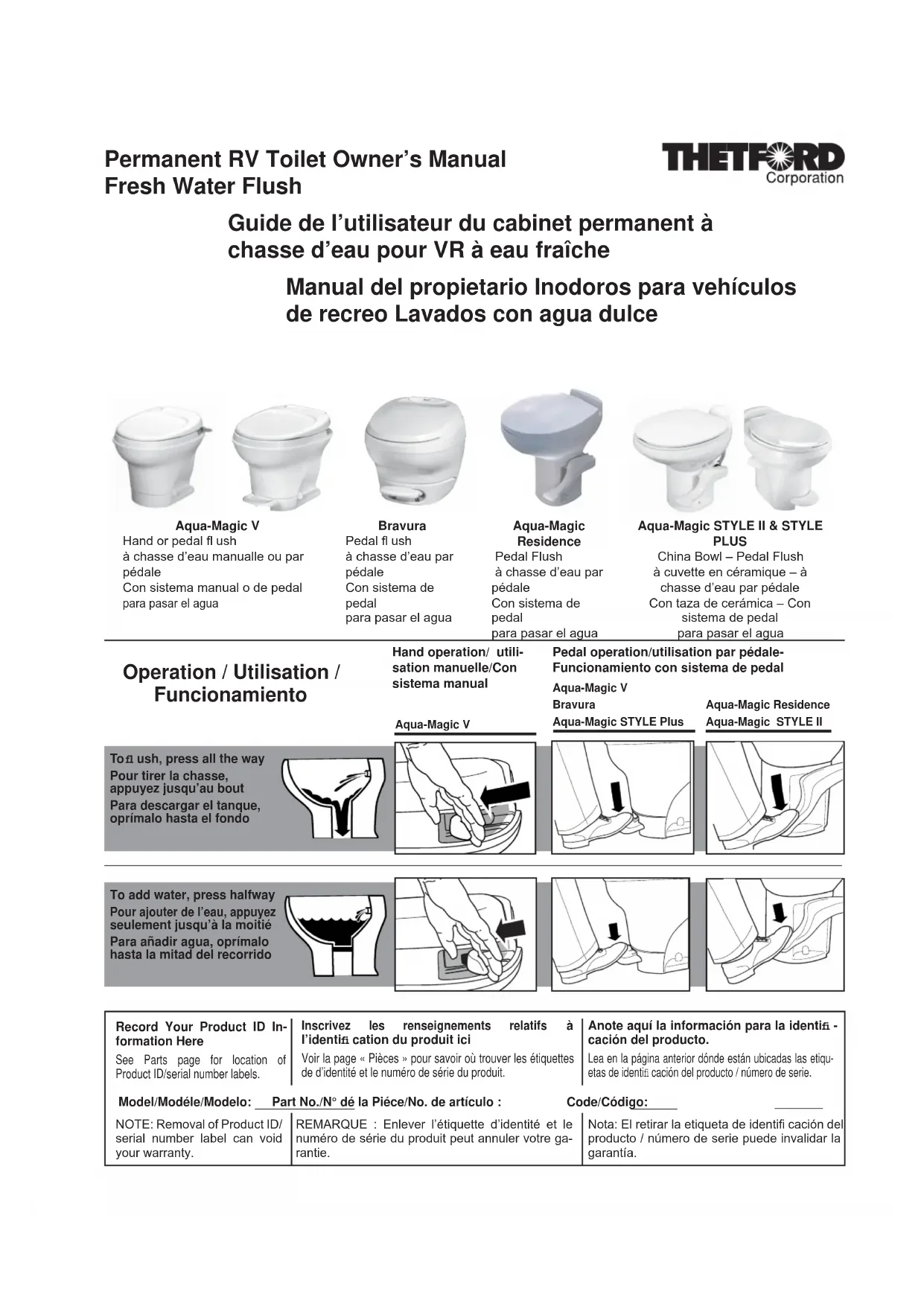ID Label/ Étiquette d’identifi cation Etiqueta de identifi cación Aqua-Magic STYLE PLUS Aqua-Magic STYLE II Aqua-Magic Residence No. Descripción ID Label/ Étiquette d’identifi cation/ Etiqueta de identifi cación ID Label/ Étiquette d’identifi cation/ Etiqueta de identifi cación †Chasse d’eau par pédale seulement 12Aqua-Kem, Bravura, Aqua-Magic V, Aqua-Magic STYLE et Aqua-Clean sont des marques de Thetford Corporation. Aqua-Kem, Bravura, Aqua-Magic V, Aqua-Magic STYLE y Aqua-Clean son marcas de Thetford Corporation. See your dealer for more information about Thet- ford products. Or, write or call: Printed In U.S.A./Imprimé aux états-Unis/Impreso en EE UU Pour obtenir de plus amples renseignements au sujet des produits Thetford, communiquez avec votre détaillant. Ou, nous écrire ou nous appeler aux adresses et aux numéros suivants : www.thetford.com Questions?/Des questions?/¿Preguntas? 1-800-521-3032 Para mayor información acerca de los produc- tos Thetford, visite al distribuidor más cercano. O, llame o escriba a: Part No. 42088 Rev. C 26.06.2012 Aqua-Kem, Bravura, Aqua-Magic V, Aqua-Magic STYLE, Aqua-Magic Resi- dence and Aqua-Clean are trademarks of Thetford Corporation.