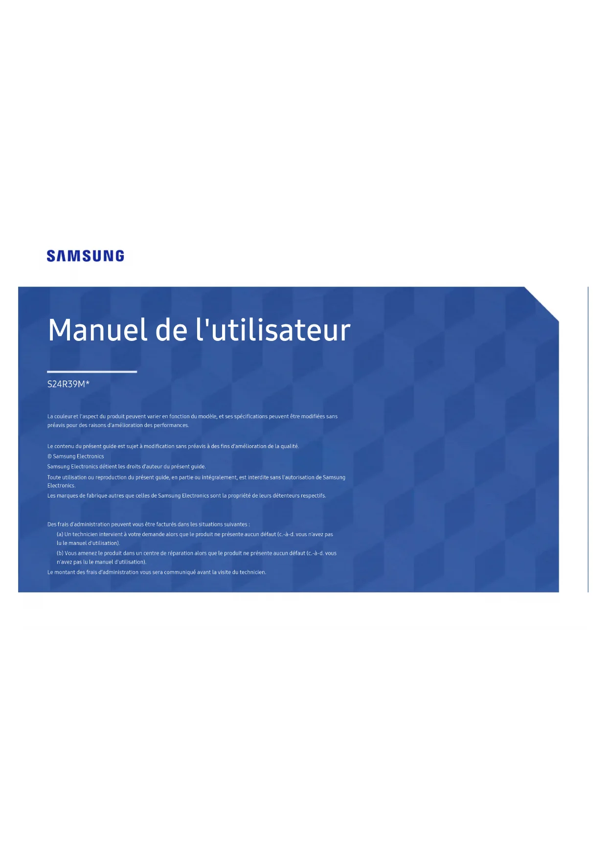 Manuel de l'utilisateur La couleur et l'aspect du produit peuvent varier en fonction du modèle, et ses spécifications peuvent être modifiées sans préavis pour des raisons d'amélioration des performances. Le contenu du présent guide est sujet à modification sans préavis à des fins d'amélioration de la qualité. © Samsung Electronics Samsung Electronics détient les droits d'auteur du présent guide. Toute utilisation ou reproduction du présent guide, en partie ou intégralement, est interdite sans l'autorisation de Samsung Electronics. Les marques de fabrique autres que celles de Samsung Electronics sont la propriété de leurs détenteurs respectifs. Des frais d'administration peuvent vous être facturés dans les situations suivantes: (a) Un technicien intervient à votre demande alors que le produit ne présente aucun défaut (c.-à-d. vous n'avez pas lu le manuel d'utilisation). (b) Vous amenez le produit dans un centre de réparation alors que le produit ne présente aucun défaut (c.-à-d. vous n'avez pas lu le manuel d'utilisation). Le montant des frais d'administration vous sera communiqué avant la visite du technicien. S24R39M*Table des matières Avant utilisation du produit Sécurisation de l'espace d'installation 4 Consignes de sécurité 4 Nettoyage 5 Électricité et sécurité 5 Installation 6 Fonctionnement 7 Stockage et entretien 9 Mise en route Panneau de configuration 10 Démarrer la configuration (Configuration initiale) 10 Télécommande 11 Installation des piles (type de pile: AAA) 12 Modification de la source d'entrée 12 Liste Source 12 Comment utiliser Modif. Nom 12 Installation 13 Fixation du socle 13