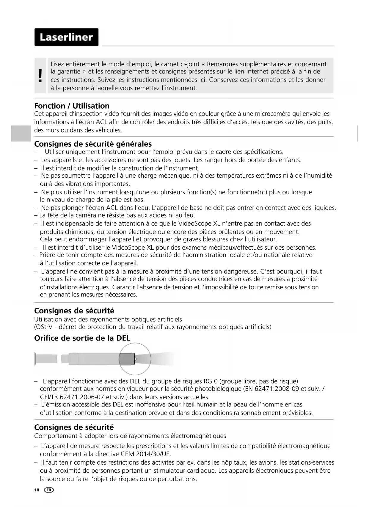 Consignes de sécurité générales – Utiliser uniquement l‘instrument pour l‘emploi prévu dans le cadre des spécications. – Les appareils et les accessoires ne sont pas des jouets. Les ranger hors de portée des enfants. – Il est interdit de modier la construction de l‘instrument. – Ne pas soumettre l’appareil à une charge mécanique, ni à des températures extrêmes ni à de l’humidité ou à des vibrations importantes. – Ne plus utiliser l‘instrument lorsqu‘une ou plusieurs fonction(s) ne fonctionne(nt) plus ou lorsque le niveau de charge de la pile est bas. – Ne pas plonger l’écran ACL dans l’eau. L’appareil de base ne doit pas entrer en contact avec des liquides. – La tête de la caméra ne résiste pas aux acides ni au feu. – Il est indispensable de faire attention à ce que le VideoScope XL n’entre pas en contact avec des produits chimiques, du tension électrique ou encore des pièces brûlantes ou en mouvement. Cela peut endommager l’appareil et provoquer de graves blessures chez l’utilisateur. – Il est interdit d’utiliser le VideoScope XL pour des examens médicaux/effectués sur des personnes. – Prière de tenir compte des mesures de sécurité de l‘administration locale et/ou nationale relative à l‘utilisation correcte de l‘appareil. – L‘appareil ne convient pas à la mesure à proximité d‘une tension dangereuse. C‘est pourquoi, il faut toujours faire attention à l‘absence de tension des pièces conductrices en cas de mesures à proximité d‘installations électriques. Garantir l‘absence de tension et l‘impossibilité de toute remise sous tension en prenant les mesures nécessaires. – L’appareil fonctionne avec des DEL du groupe de risques RG 0 (groupe libre, pas de risque) conformément aux normes en vigueur pour la sécurité photobiologique (EN 62471:2008-09 et suiv. / CEI/TR 62471:2006-07 et suiv.) dans leurs versions actuelles. – L’émission accessible des DEL est inoffensive pour l‘œil humain et la peau de l’homme en cas d’utilisation conforme à la destination prévue et dans des conditions raisonnablement prévisibles. Consignes de sécurité Comportement à adopter lors de rayonnements électromagnétiques – L’appareil de mesure respecte les prescriptions et les valeurs limites de compatibilité électromagnétique conformément à la directive CEM 2014/30/UE. – Il faut tenir compte des restrictions des activités par ex. dans les hôpitaux, les avions, les stations-services ou à proximité de personnes portant un stimulateur cardiaque. Les appareils électroniques peuvent être la source ou faire l‘objet de risques ou de perturbations. Consignes de sécurité Utilisation avec des rayonnements optiques artificiels (OStrV - décret de protection du travail relatif aux rayonnements optiques artificiels) Orifice de sortie de la DELVideoScope XL