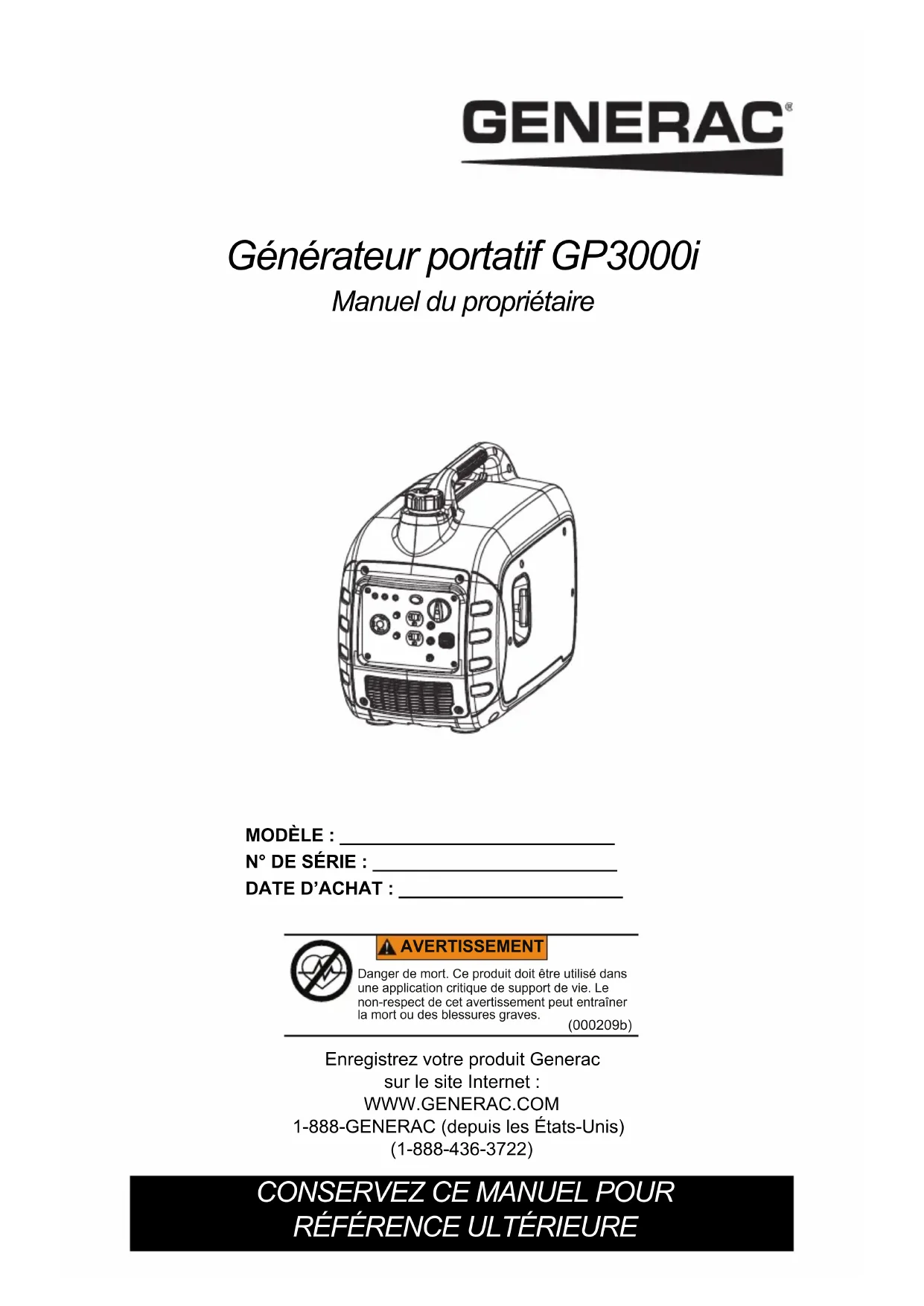 AVERTISSEMENT (000209b)Danger de mort. Ce produit doit être utilisé dans une application critique de support de vie. Le non-respect de cet avertissement peut entraîner la mort ou des blessures graves. Enregistrez votre produit Generac sur le site Internet :