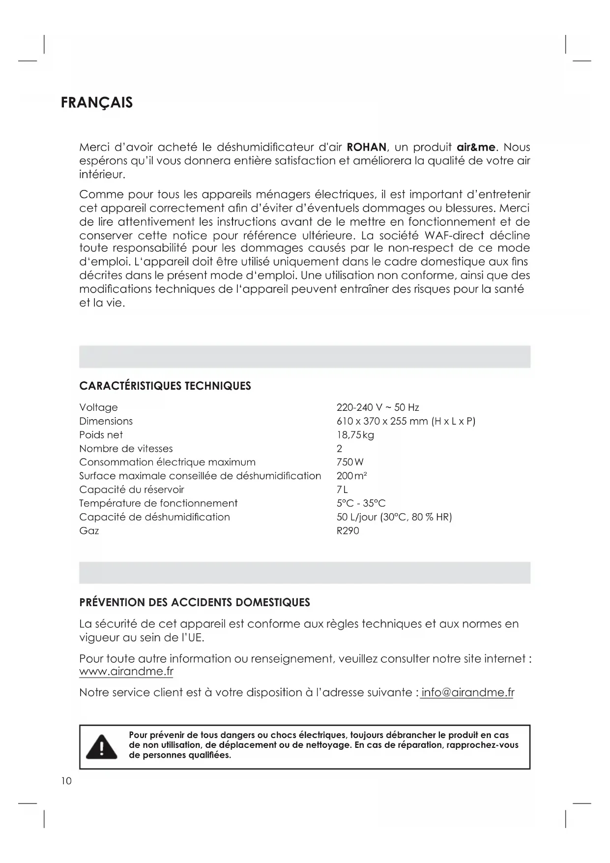 > La [ Sécurité enfants ] est enclenchée et les autres boutons de commande sont bloqués. ÉCRAN DIGITAL17 FAQ Problème Raison Solution L'appareil ne marche pas > Le produit n’est pas correctement branché ou il y a un problème de concordance électrique. > Branchez correctement la prise en vous assurant du voltage et du bon fonctionnement du réseau électrique. Évitez les multiprises. > Il y a un problème sur le réseau électrique du logement. > Le réservoir est plein. > Videz le réservoir. > Le réservoir n’est pas correctement enclenché. > Poussez et enclenchez correctement le réservoir. Baisse de performance de l’appareil (moins d’eau dans le réservoir) > Le ltre amovible est sale, ce qui gêne le ux d’air. > Nettoyez le ltre amovible. > L’entrée ou la sortie d’air est bloquée par quelque chose. > Laissez au moins un espace de 50 cm à l’arrière, sur les côtés et devant l’appareil. > La température est trop basse. > En dessous de 5°C le produit fonctionne en Mode [ Anti-gel ]. Le produit ne peut donc pas déshumidier au maximum de sa capacité. > Le taux d’humidité est déjà bas. Bruit anormal > Quelque chose bloque le ventilateur. > Assurez-vous qu’aucun objet bloque le ux d’air. > Le produit a un problème de fonctionnement. > Rapprochez-vous de votre revendeur pour une prise en charge SAV. > L'appareil émet une sorte de chuchotement. > Ceci est le son produit par le gaz réfrigérant. Ce phénomène est normal. Fuite > L'appareil est incliné ou mal immobilisé. > Placez l'appareil sur une surface plane avant sa mise en marche. > La connexion de l'appareil au tuyau de drainage s'est desserrée. > Fixez le tuyau de drainage correctement. > Le tuyau de drainage est plié, tordu ou bouché. > Enlevez les éléments obstruants et redressez le tuyau. L'appareil ne produit pas d'air > Le ltre à air est bouché. > Reportez-vous au paragraphe « Maintenance ». L'air qui sort de l'appareil est chaud > An d'extraire l'air de la pièce, le compresseur du déshumidicateur chauffe légèrement l'air. > Ce phénomène est normal.18 Thank you for having purchased the ROHAN domestic air dehumidier, an air&me. product. We hope that it will bring you complete satisfaction and improve your indoor air quality. As with all electrical appliances, it is important to maintain the appliance properly in order to avoid any damage or injury. Please read these instructions carefully before switching the appliance on and keep them for later reference. WAF-direct society accepts no liability for any damage that is caused by noncompliance with this instruction manual. The appliance is only to be used in the household for the intended purposes described in this user manual. Using the appliance for other purposes than the intended ones or performing technical changes to the appliance could be hazardous for health and life. ENGLISH