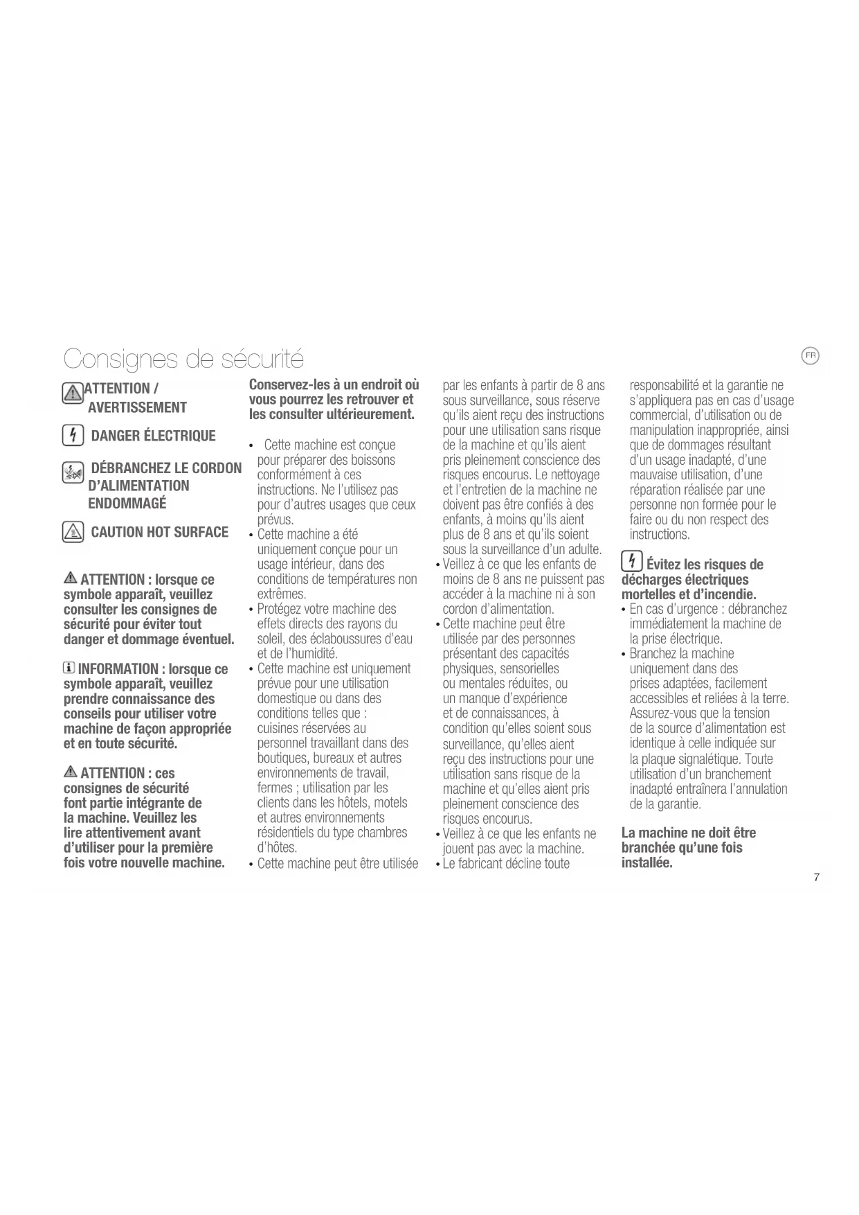 Cette machine est conçue pour préparer des boissons conformément à ces instructions. Ne l’utilisez pas pour d’autres usages que ceux prévus.