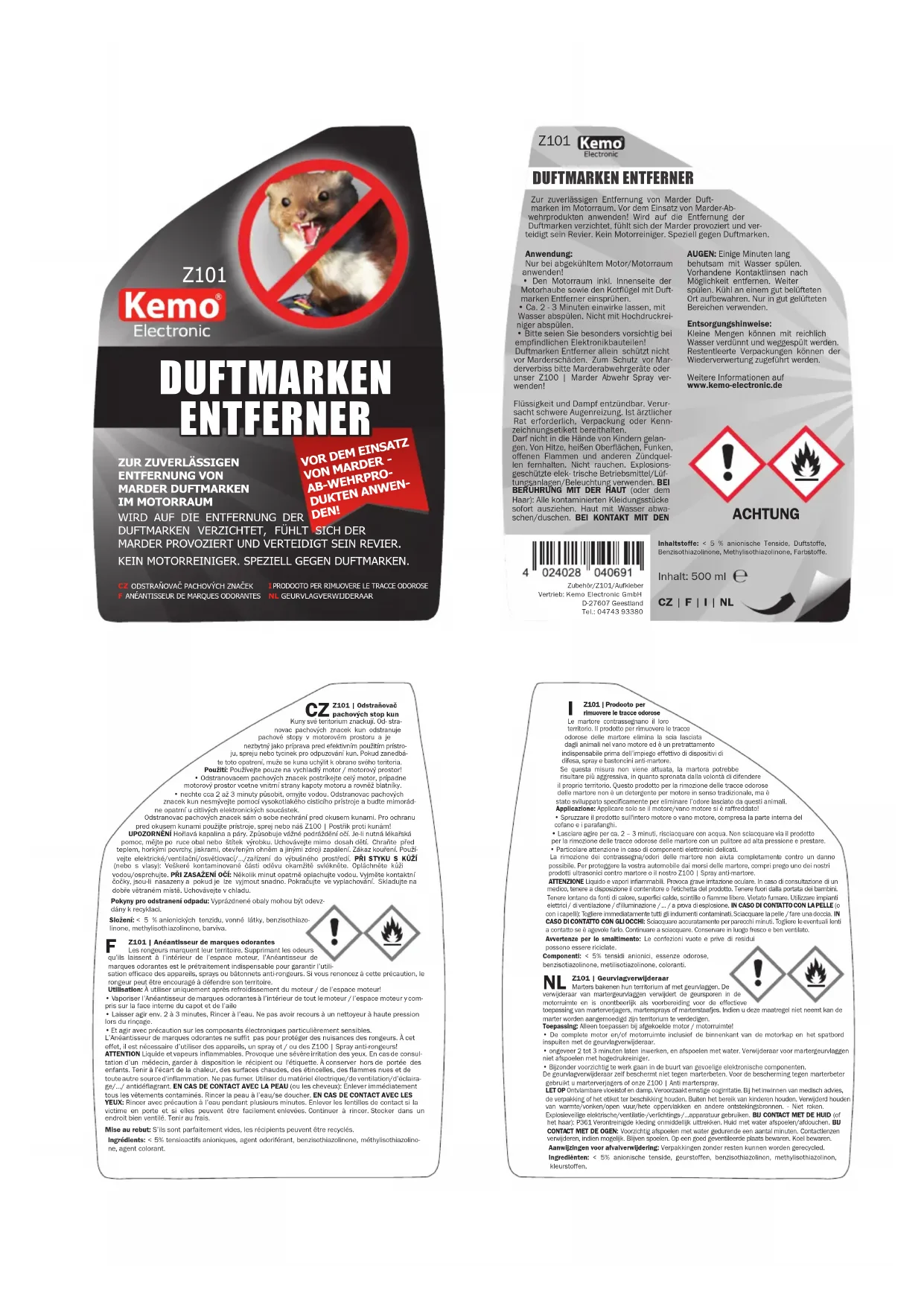 - Den Motorraum inkl. Innenseite der Motorhaube sowie den Kotflügel mit Duft-marken Entferner einsprühen.• Ca. 2 - 3 Minuten einwirke lassen, mit Wasser abspülen. Nicht mit Hochdruckrei-niger abspülen.• Bitte seien Sie besonders vorsichtig bei empfindlichen Elektronikbauteilen!Duftmarken Entferner allein schützt nicht vor Marderschäden. Zum Schutz vor Mar-derverbiss bitte Marderabwehrgeräte oder unser Z100 | Marder Abwehr Spray ver- wenden!Flüssigkeit und Dampf entzündbar. Verur-sacht schwere Augenreizung. Ist ärztlicher Rat erforderlich, Verpackung oder Kenn- zeichnungsetikett bereithalten. Darf nicht in die Hände von Kindern gelan-gen. Von Hitze, heißen Oberflächen, Funken, offenen Flammen und anderen Zündquel- len fernhalten. Nicht rauchen. Explosions- geschützte elek- trische Betriebsmittel/Lüf-tungsanlagen/Beleuchtung verwenden. BEI BERÜHRUNG MIT DER HAUT (oder dem Haar): Alle kontaminierten Kleidungsstücke sofort ausziehen. Haut mit Wasser abwa- schen/duschen. BEI KONTAKT MIT DEN AUGEN: Einige Minuten lang behutsam mit Wasser spülen. Vorhandene Kontaktlinsen nach Möglichkeit entfernen. Weiter spülen. Kühl an einem gut belüfteten Ort aufbewahren. Nur in gut gelüfteten Bereichen verwenden.Entsorgungshinweise:Kleine Mengen können mit reichlich Wasser verdünnt und weggespült werden. Restentleerte Verpackungen können der Wiederverwertung zugeführt werden. Weitere Informationen auf www.kemo-electronic.deZur zuverlässigen Entfernung von Marder Duft- marken im Motorraum. Vor dem Einsatz von Marder-Ab- wehrprodukten anwenden! Wird auf die Entfernung der Duftmarken verzichtet, fühlt sich der Marder provoziert und ver-teidigt sein Revier. Kein Motorreiniger. Speziell gegen Duftmarken.Zubehör/Z101/Aufkleber Vertrieb: Kemo Electronic GmbH D-27607 GeestlandTel.: 04743 93380 Inhalt: 500 mlCZ | F | I | NLInhaltstoffe: < 5 % anionische Tenside, Duftstoffe, Benzisothiazolinone, Methylisothiazolinone, Farbstoffe. ACHTUNG Z101 | Odstraňovač pachových stop kunKuny své teritorium znackují. Od- stra-novac pachových znacek kun odstranuje pachové stopy v motorovém prostoru a je nezbytný jako príprava pred efektivním použitím prístro-ju, spreju nebo tycinek pro odpuzování kun. Pokud zanedbá-te toto opatrení, muže se kuna uchýlit k obrane svého teritoria.Použití: Používejte pouze na vychladlý motor / motorový prostor! • Odstranovacem pachových znacek postríkejte celý motor, prípadne motorový prostor vcetne vnitrní strany kapoty motoru a rovněž blatníky.• nechte cca 2 až 3 minuty působit, omyjte vodou. Odstranovac pachových znacek kun nesmývejte pomocí vysokotlakého cisticího prístroje a budte mimorád-ne opatrní u citlivých elektronických soucástek. Odstranovac pachových znacek sám o sobe nechrání pred okusem kunami. Pro ochranu pred okusem kunami použijte prístroje, sprej nebo náš Z100 | Postřik proti kunám!UPOZORNĚNÍ Hořlavá kapalina a páry. Způsobuje vážné podráždění očí. Je-li nutná lékařská pomoc, mějte po ruce obal nebo štítek výrobku. Uchovávejte mimo dosah dětí. Chraňte před teplem, horkými povrchy, jiskrami, otevřeným ohněm a jinými zdroji zapálení. Zákaz kouření. Použí- vejte elektrické/ventilační/osvětlovací/…/zařízení do výbušného prostředí. PŘI STYKU S KŮŽÍ (nebo s vlasy): Veškeré kontaminované části oděvu okamžitě svlékněte. Opláchněte kůži vodou/osprchujte. PŘI ZASAŽENÍ OČÍ: Několik minut opatrně oplachujte vodou. Vyjměte kontaktní čočky, jsou-li nasazeny a pokud je lze vyjmout snadno. Pokračujte ve vyplachování. Skladujte na dobře větraném místě. Uchovávejte v chladu.Pokyny pro odstranení odpadu: Vyprázdnené obaly mohou být odevz-dány k recyklaci. Složení: < 5 % anionických tenzidu, vonné látky, benzisothiazo-linone, methylisothiazolinone, barviva.Z101 | Anéantisseur de marques odorantesLes rongeurs marquent leur territoire. Supprimant les odeurs qu’ils laissent à l’intérieur de l’espace moteur, l’Anéantisseur de marques odorantes est le prétraitement indispensable pour garantir l’utili-sation efficace des appareils, sprays ou bâtonnets anti-rongeurs. Si vous renoncez à cette précaution, le rongeur peut être encouragé à défendre son territoire. Utilisation: À utiliser uniquement après refroidissement du moteur / de l’espace moteur!