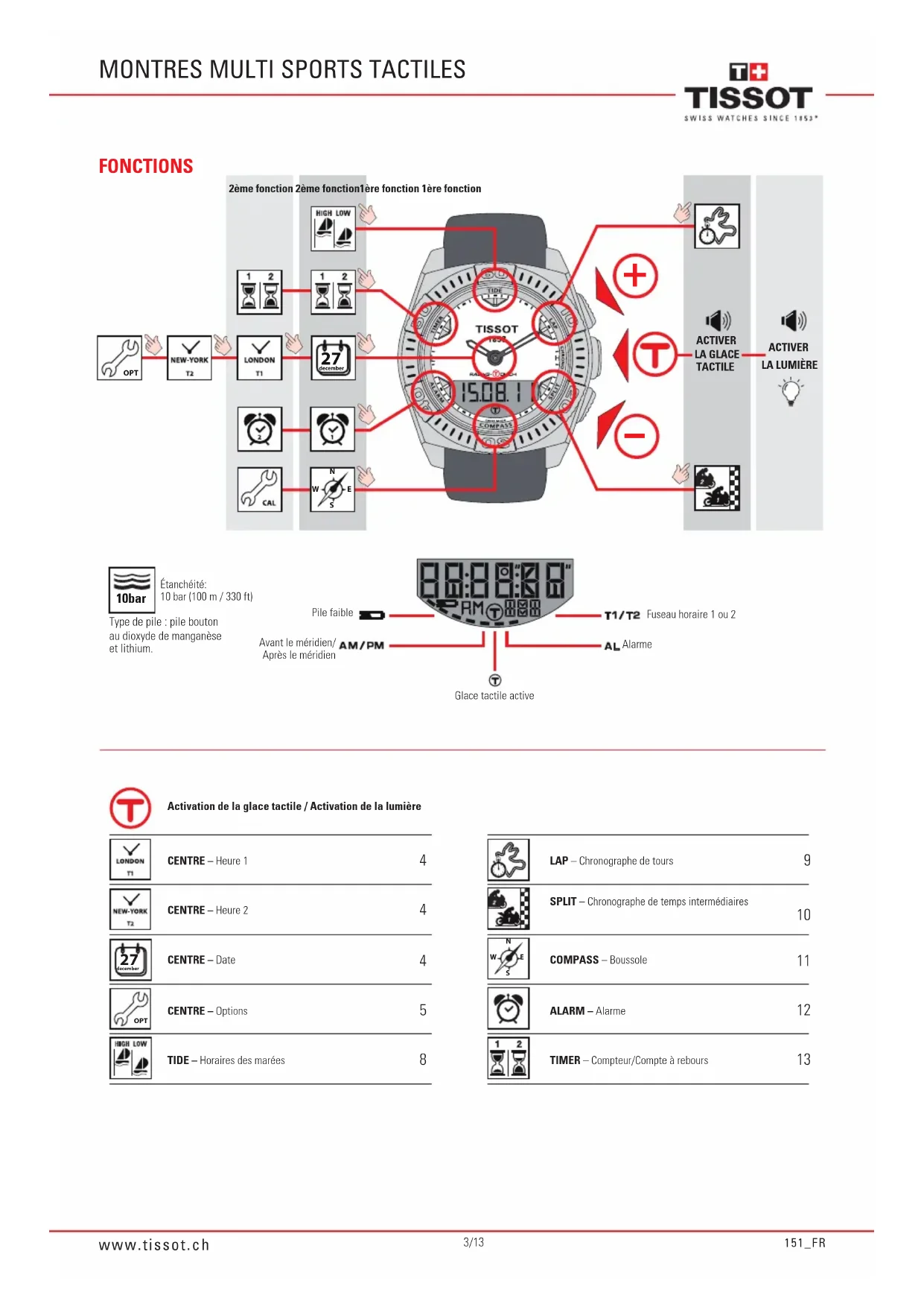 decemberNSEWOPT OPT 10bar Type de pile : pile bouton au dioxyde de manganèse et lithium.FONCTIONSPile faibleAlarmeAvant le méridien/Après le méridienFuseau horaire 1 ou 2Étanchéité: 10 bar (100 m / 330 ft)Glace tactile active2ème fonction 2ème fonction1ère fonction 1ère fonctionACTIVER LA LUMIÈREACTIVER LA GLACE TACTILECENTRE – Heure 1 CENTRE – Heure 2 CENTRE – Date CENTRE – Options LAP – Chronographe de tours SPLIT – Chronographe de temps intermédiaires ALARM – Alarme TIMER – Compteur/Compte à rebours COMPASS – Boussole TIDE – Horaires des marées Activation de la glace tactile / Activation de la lumièrewww.tissot.ch 151_FR 4/13