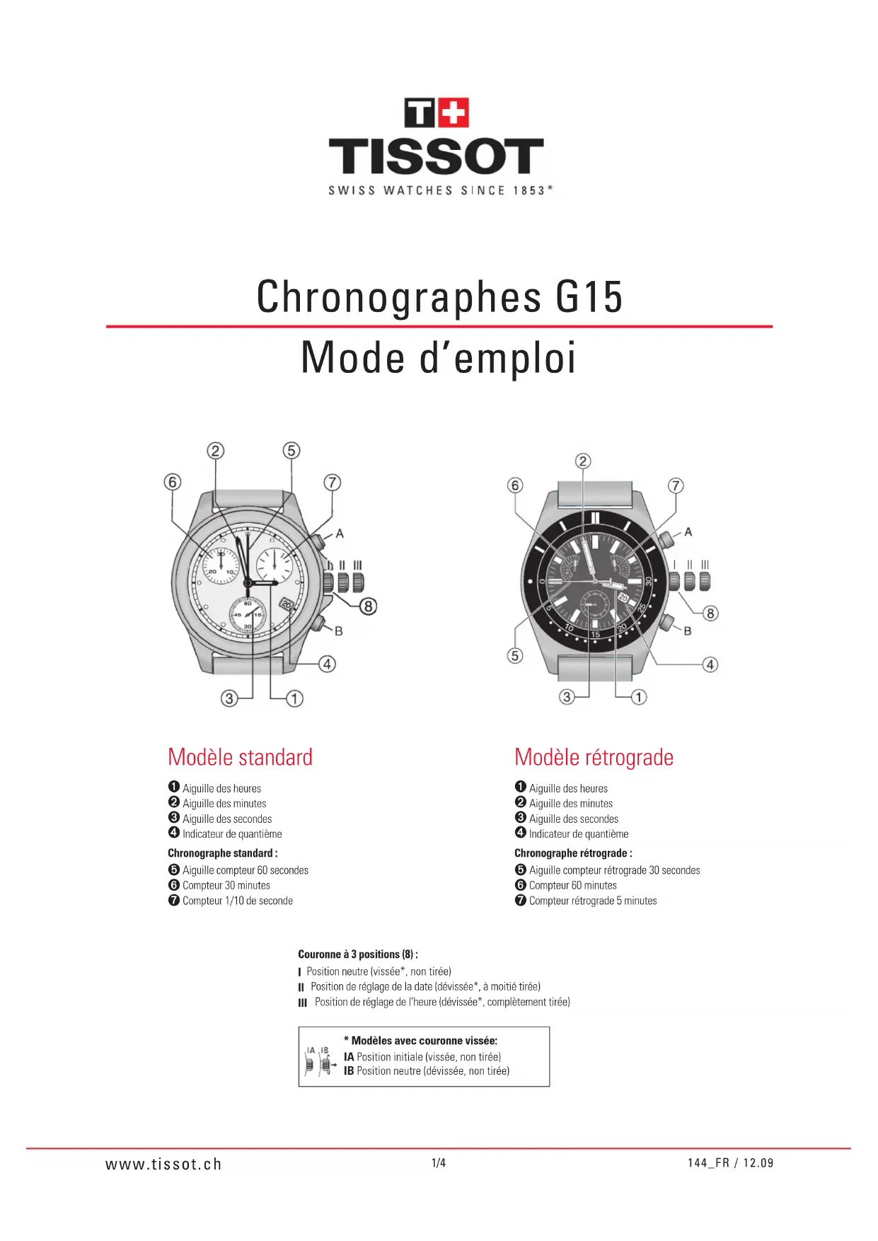 III.Important : Après toute manipulation, revissez impérativement la couronne afin de préserver l’étanchéité de la montre.Mise à l’heureTirez la couronne en position III et tournez-la en avant ou en arrière pour la mettre à l’heure souhaitée. Synchronisez l’aiguille de petite seconde située à 6 heures avec un signal horaire officiel (radio/ TV/Internet) en tirant la couronne au deuxième cran; l’aiguille s’arrête. Dès que l’heure est synchronisée, repoussez la couronne en position I (et revissez-la si vous disposez d’un modèle avec couronne vissée).RemontageLes montres à quartz ne nécessitent aucun remontage.Correction rapide de la dateTirez la couronne en position et tournez-la en arrière jusqu’à l’affichage de la date souhaitée.Tachymètre (selon les modèles) Le tachymètre permet de mesurer la vitesse d’un objet qui se déplace à une vitesse constante. Démarrez le chronométrage et arrêtez-le une fois la distance de 1 km parcourue. L’aiguille du chronographe pointe alors un chiffre sur l’échelle tachymétrique, indiquant la vitesse en km/h. Remerciements Nous vous remercions d’avoir choisi un chronographe de marque TISSOT , une marque suisse parmi les plus réputées au monde. De construction soignée, utilisant des matériaux et des composants de haute qualité, il est protégé contre les chocs, les variations de température, l’eau, la poussière. Ce mode d’emploi est valable pour les chronographes à quartz TISSOT standard et rétrograde avec mouvement G15. Pour les réglages et l’utilisation de votre chronographe, veuillez vous référez aux instructions correspondant à votre modèle. Votre chronographe vous permet de chronométrer des événements d’une durée allant jusqu’à 30 ou 60* minutes et vous offre les fonctions suivantes: – Fonction chronographe standard START–STOP– Fonction ADD (temps partiels)– Fonction SPLIT (temps intermédiaires) Pour un fonctionnement parfait et précis de votre chronographe durant de longues années, nous vous conseillons de suivre attentivement les conseils donnés dans ce mode d’emploi. *Modèle rétrograde Initialisation des compteurs (modèle standard) Les compteurs doivent être mis à zéro avant le début du chronométrage. Si nécessaire, procédez comme suit : • Mise à zéro de l’aiguille du compteur 30 minutes: - Couronne en position , poussoir