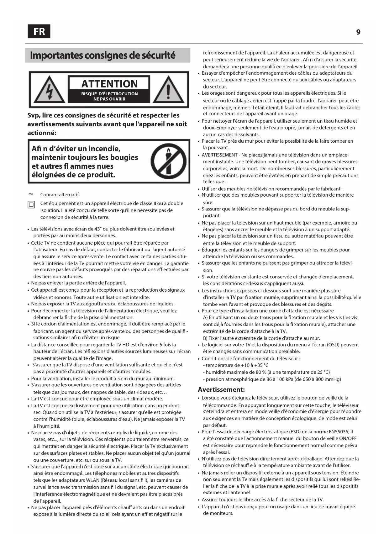 - N'utilisez pas de télévision directement après déballage. Attendez que la télévision se réchauff e à la température ambiante avant de l'utiliser.
