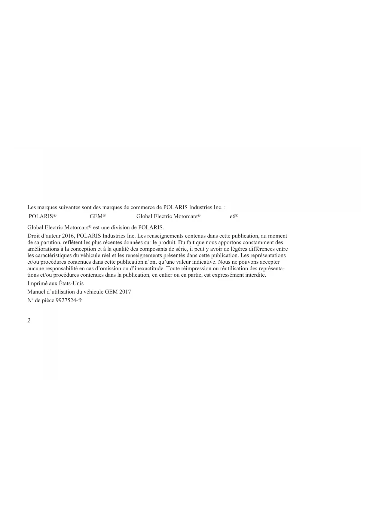 est une division de POLARIS. Droit d’auteur 201, POLARIS Industries Inc. Les renseignements contenus dans cette publication, au moment de sa parution, reflètent les plus récentes données sur le produit. Du fait que nous apportons constamment des améliorations à la conception et à la qualité des composants de série, il peut y avoir de légères différences entre les caractéristiques du véhicule réel et les renseignements présentés dans cette publication. Les représentations et/ou procédures contenues dans cette publication n’ont qu’une valeur indicative. Nous ne pouvons accepter aucune responsabilité en cas d’omission ou d’inexactitude. Toute réimpression ou réutilisation des représenta- tions et/ou procédures contenues dans la publication, en entier ou en partie, est expressément interdite. Imprimé aux États-Unis Manuel d’utilisation du véhicule GEM 201 Nº de pièce 992-fr POLARIS
