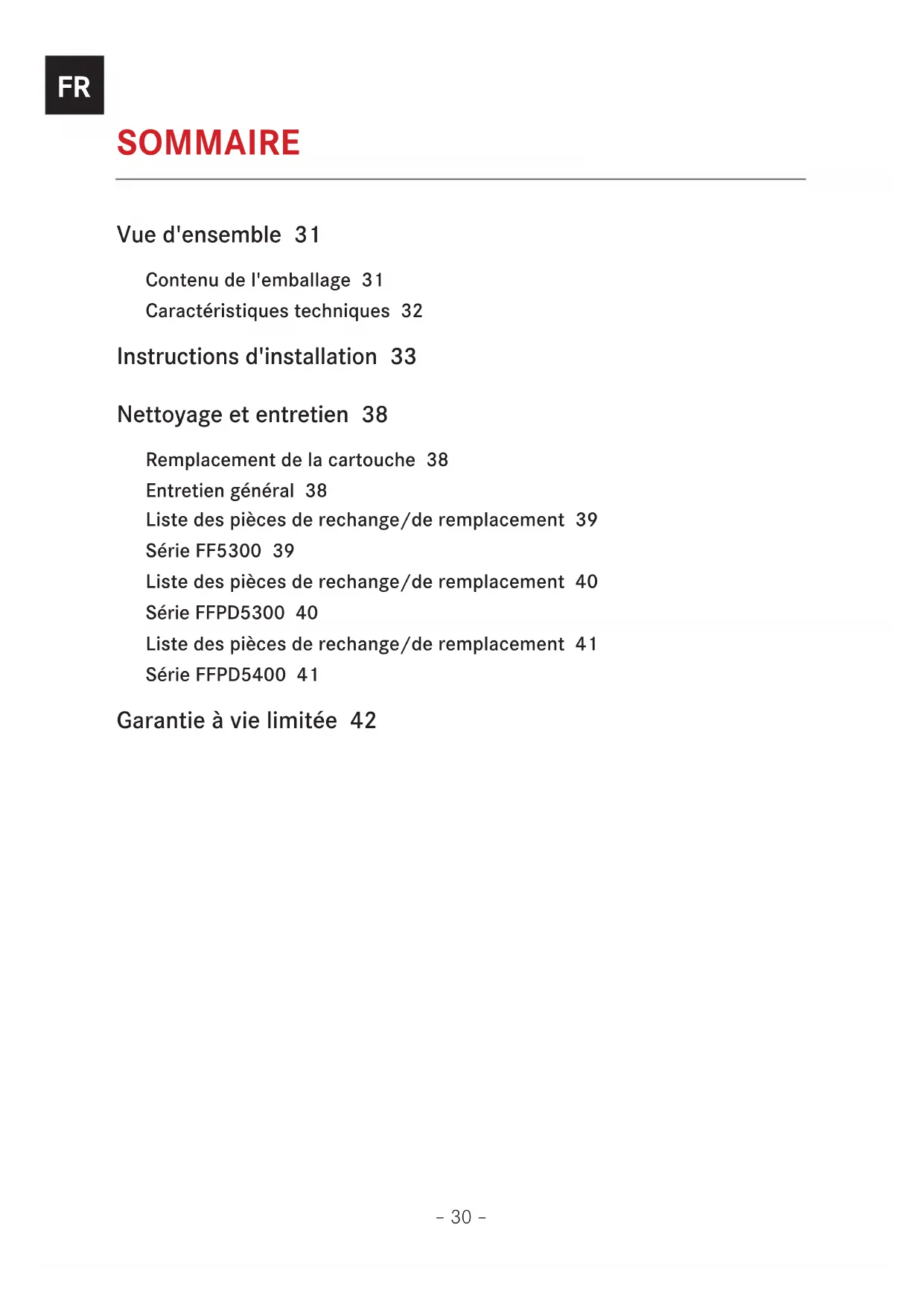 SOMMAIRE Vue d'ensemble 31 Contenu de l'emballage 31 Caractéristiques techniques 32 Instructions d'installation 33 Nettoyage et entretien 38 Remplacement de la cartouche 38 Entretien général 38 Liste des pièces de rechange/de remplacement 39 Série FF5300 39 Liste des pièces de rechange/de remplacement 40 Série FFPD5300 40 Liste des pièces de rechange/de remplacement 41 Série FFPD5400 41 Garantie à vie limitée 42– 31 –