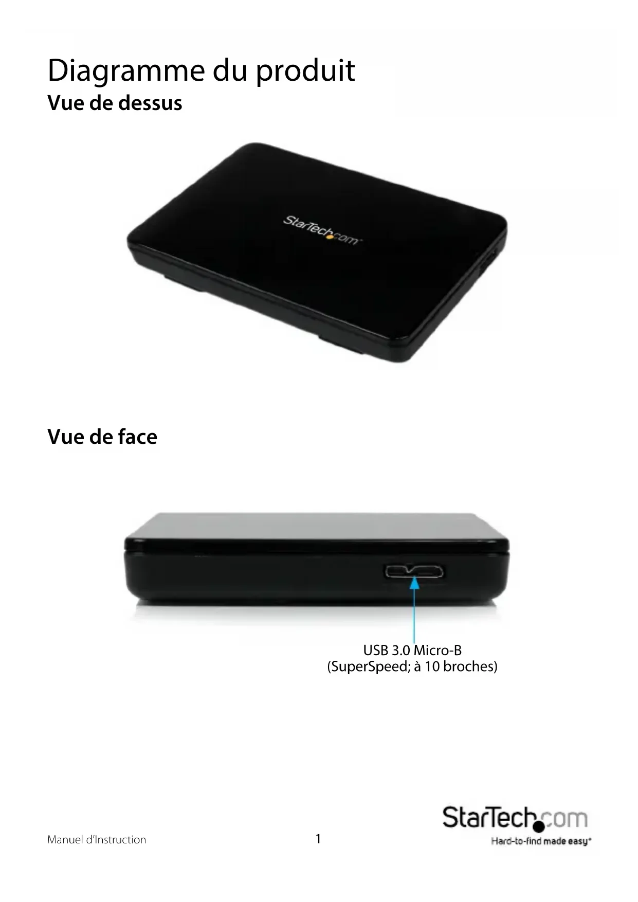 Diagramme du produit Vue de dessus Vue de face USB 3.0 Micro-B (SuperSpeed; à 10 broches)Manuel d’Instruction