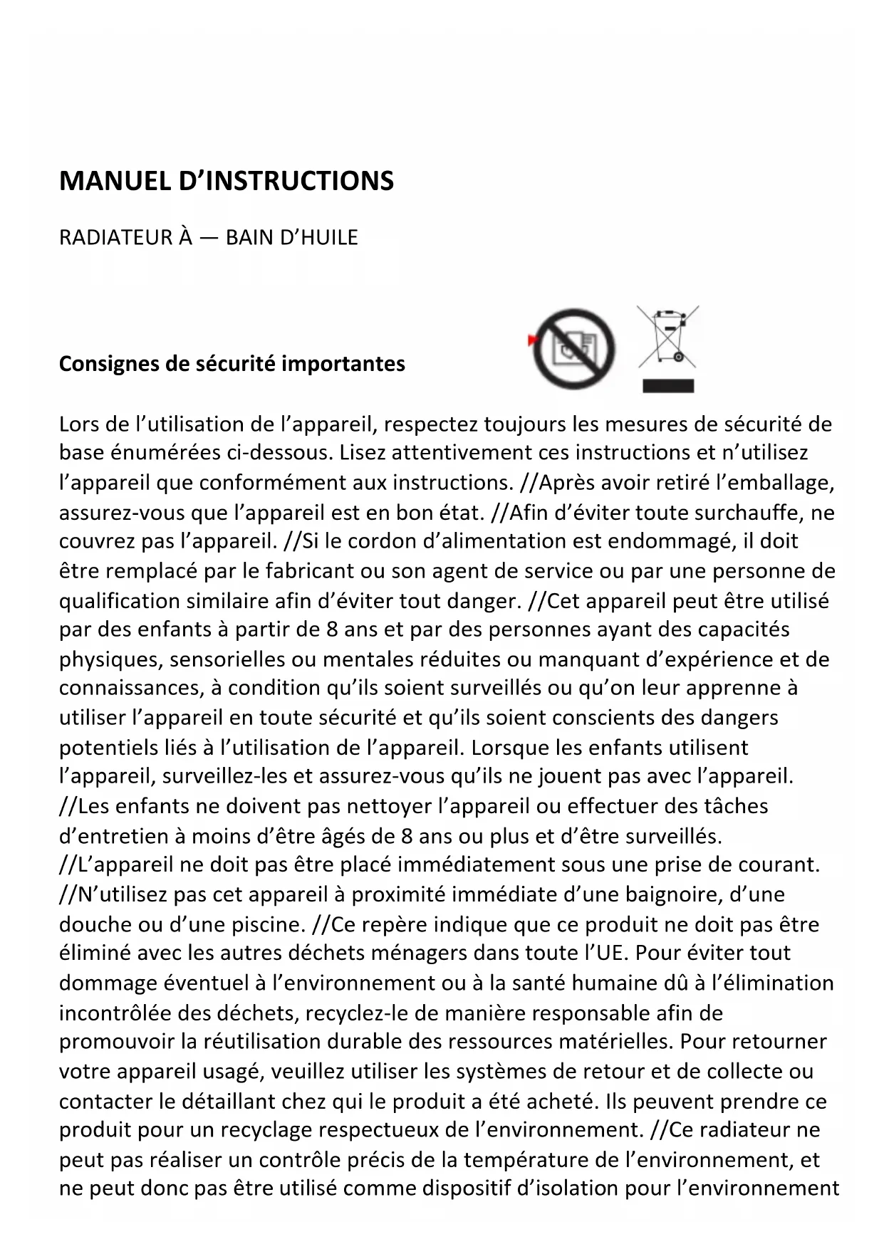 Consignes de sécurité importantes Lors de l’utilisation de l’appareil, respectez toujours les mesures de sécurité de base énumérées ci-dessous. Lisez attentivement ces instructions et n’utilisez l’appareil que conformément aux instructions. //Après avoir retiré l’emballage, assurez-vous que l’appareil est en bon état. //Afin d’éviter toute surchauffe, ne couvrez pas l’appareil. //Si le cordon d’alimentation est endommagé, il doit être remplacé par le fabricant ou son agent de service ou par une personne de qualification similaire afin d’éviter tout danger. //Cet appareil peut être utilisé par des enfants à partir de 8 ans et par des personnes ayant des capacités physiques, sensorielles ou mentales réduites ou manquant d’expérience et de connaissances, à condition qu’ils soient surveillés ou qu’on leur apprenne à utiliser l’appareil en toute sécurité et qu’ils soient conscients des dangers potentiels liés à l’utilisation de l’appareil. Lorsque les enfants utilisent l’appareil, surveillez-les et assurez-vous qu’ils ne jouent pas avec l’appareil. //Les enfants ne doivent pas nettoyer l’appareil ou effectuer des tâches d’entretien à moins d’être âgés de 8 ans ou plus et d’être surveillés. //L’appareil ne doit pas être placé immédiatement sous une prise de courant. //N’utilisez pas cet appareil à proximité immédiate d’une baignoire, d’une douche ou d’une piscine. //Ce repère indique que ce produit ne doit pas être éliminé avec les autres déchets ménagers dans toute l’UE. Pour éviter tout dommage éventuel à l’environnement ou à la santé humaine dû à l’élimination incontrôlée des déchets, recyclez-le de manière responsable afin de promouvoir la réutilisation durable des ressources matérielles. Pour retourner votre appareil usagé, veuillez utiliser les systèmes de retour et de collecte ou contacter le détaillant chez qui le produit a été acheté. Ils peuvent prendre ce produit pour un recyclage respectueux de l’environnement. //Ce radiateur ne peut pas réaliser un contrôle précis de la température de l’environnement, et ne peut donc pas être utilisé comme dispositif d’isolation pour l’environnementde stockage, les articles, les animaux et les plantes. //Ce radiateur est rempli d’une quantité précise d’huile spéciale. Les réparations nécessitant l’ouverture du réservoir d’huile ne doivent être effectuées que par le fabricant ou son agent de service qui doit être contacté en cas de fuite d’huile. Lors de la mise au rebut de l’appareil, respectez les réglementations concernant la mise au rebut de l’huile. // 10. Ce radiateur ne peut pas assurer un contrôle précis de la température de l’environnement et ne peut donc pas être utilisé comme dispositif d’isolation de l’environnement de stockage, des articles, des animaux et des plantes. //L’appareil est destiné à un usage domestique uniquement. Attention Il existe un risque d’incendie si le radiateur est recouvert ou placé à proximité de rideaux ou d’autres matériaux combustibles. //Certaines parties de ce produit peuvent devenir très chaudes et provoquer des brûlures. Une attention particulière doit être accordée aux endroits où se trouvent des enfants et des personnes vulnérables.PIÈCE (OR2000M) Ailerons