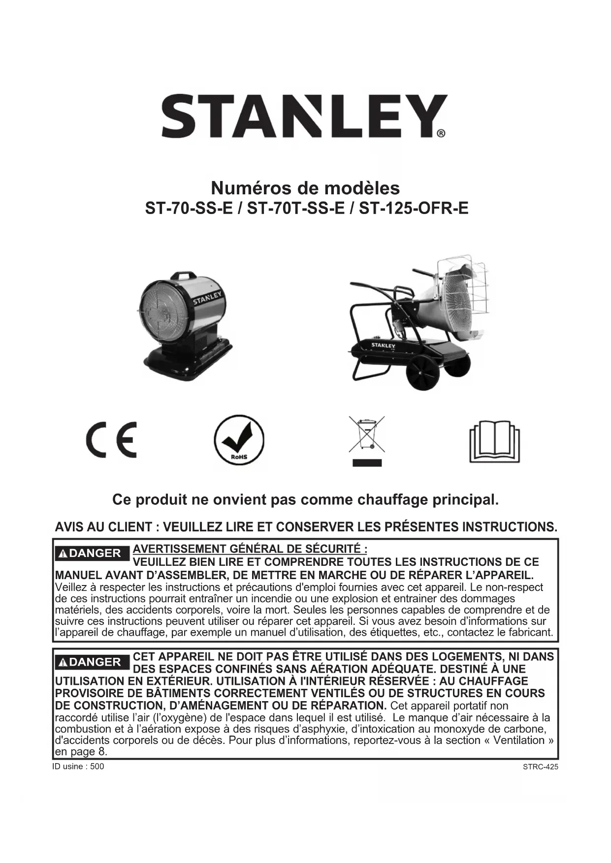 REP Obelis S.A. Geregistreerd adres: Bd. Général Wahis, 53 1030 Brussels, Belgium © 2021 Stanley Black & Decker, Inc.AVIS AU CLIENT : VEUILLEZ LIRE ET CONSERVER LES PRÉSENTES INSTRUCTIONS. AVERTISSEMENT GÉNÉRAL DE SÉCURITÉ : VEUILLEZ BIEN LIRE ET COMPRENDRE TOUTES LES INSTRUCTIONS DE CE MANUEL AVANT D’ASSEMBLER, DE METTRE EN MARCHE OU DE RÉPARER L’APPAREIL. Veillez à respecter les instructions et précautions d'emploi fournies avec cet appareil. Le non-respect de ces instructions pourrait entraîner un incendie ou une explosion et entrainer des dommages matériels, des accidents corporels, voire la mort. Seules les personnes capables de comprendre et de suivre ces instructions peuvent utiliser ou réparer cet appareil. Si vous avez besoin d’informations sur l’appareil de chauffage, par exemple un manuel d’utilisation, des étiquettes, etc., contactez le fabricant. DANGER CET APPAREIL NE DOIT PAS ÊTRE UTILISÉ DANS DES LOGEMENTS, NI DANS DES ESPACES CONFINÉS SANS AÉRATION ADÉQUATE. DESTINÉ À UNE UTILISATION EN EXTÉRIEUR. UTILISATION À l'INTÉRIEUR RÉSERVÉE : AU CHAUFFAGE PROVISOIRE DE BÂTIMENTS CORRECTEMENT VENTILÉS OU DE STRUCTURES EN COURS DE CONSTRUCTION, D’AMÉNAGEMENT OU DE RÉPARATION. Cet appareil portatif non raccordé utilise l’air (l’oxygène) de l'espace dans lequel il est utilisé. Le manque d’air nécessaire à la combustion et à l’aération expose à des risques d’asphyxie, d’intoxication au monoxyde de carbone, d'accidents corporels ou de décès. Pour plus d’informations, reportez-vous à la section « Ventilation » en page 8. DANGER ID usine : 500 Numéros de modèles