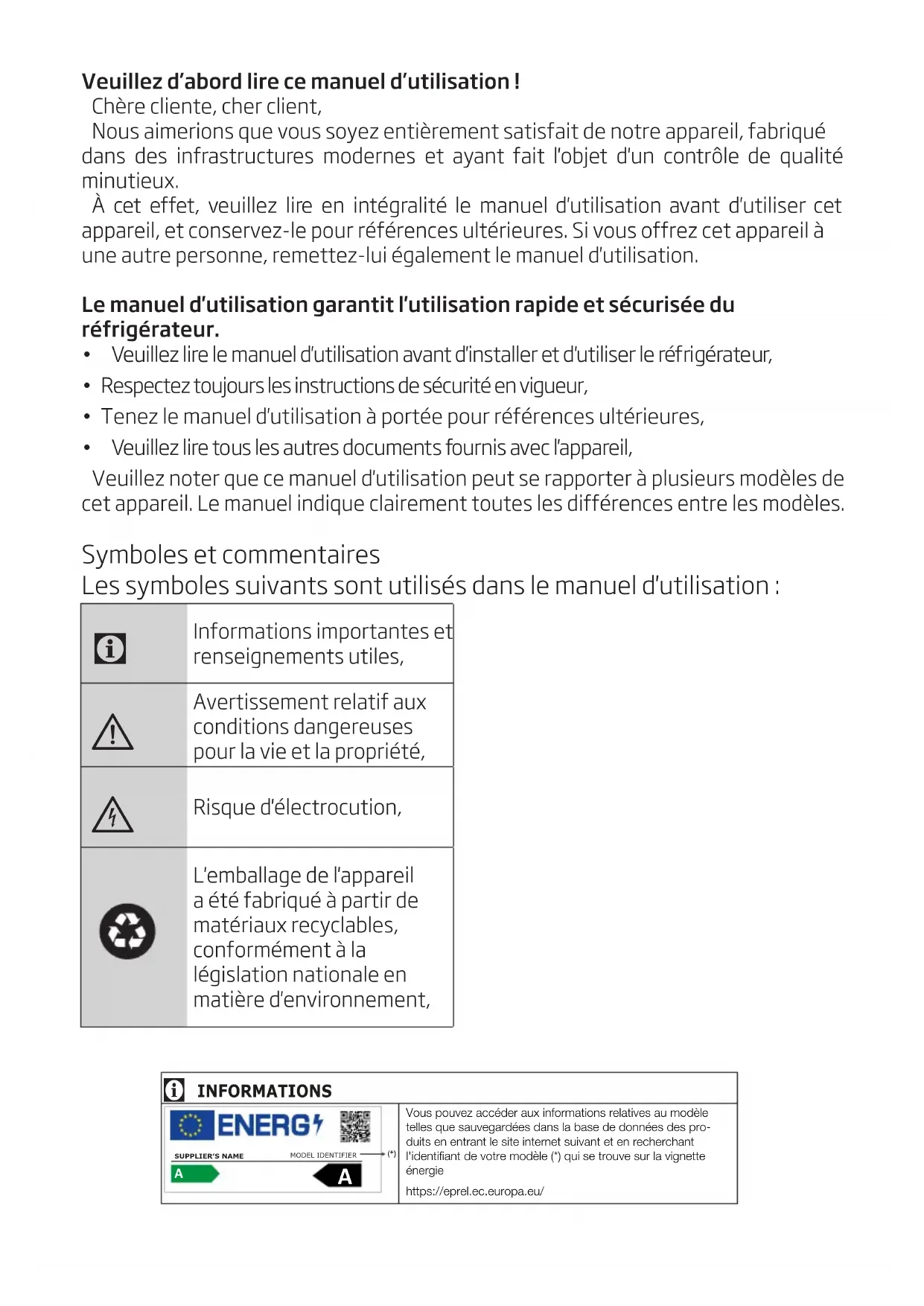 Risque d'électrocution, L'emballage de l'appareil a été fabriqué à partir de matériaux recyclables, conformément à la législation nationale en matière d'environnement, INFORMATIONS Vous pouvez accéder aux informations relatives au modèle telles que sauvegardées dans la base de données des pro-duits en entrant le site internet suivant et en recherchant l'identifiant de votre modèle (*) qui se trouve sur la vignette énergiehttps://eprel.ec.europa.eu/