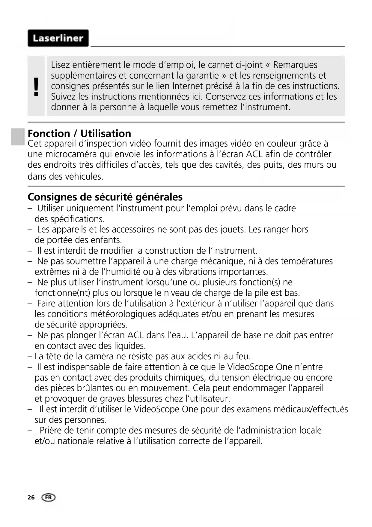 EU-bestemmelser og bortskaffelse Apparatet opfylder alle påkrævede standarder for fri vareomsætning inden for EU. Dette produkt er et elapparat og skal indsamles og bortskaffes separat i henhold til EF-direktivet for (brugte) elapparater. Flere sikkerhedsanvisninger og supplerende tips på: www.laserliner.com/info Tekniske data Ret til ændringer forbeholdt. 21W38 Diameter kamerahoved ø 9 mm Skærmtype 2,7" TFT-farvedisplay Opløsning display 320 x 240 Pixel Kapslingsklasse kamerasonde IP 68 Opløsning kamera 320 x 240 Pixel Forbindelser Video-udgang cinch Synsfelt (FOV) 53° Dybdeskarphed (DOF) 3 … 7 cm Sondelængde 1,5 m Strømforsyning 4 x 1,5V LR6 (AA) Drifttid ca. 4 timer Arbejdsbetingelser 0°C … 45°C, luftfugtighed maks. 20 … 85% rH, ikke-kondenserende, arbejds- højde maks. 4000 m.o.h. Opbevaringsbetingelser -10°C … 60°C, luftfugtighed maks. 80% rH Mål (b x h x l) 100 x 200 x 130 mm (uden flexslange) Vægt 510 g (inkl. batterier) DA26 Consignes de sécurité générales – Utiliser uniquement l‘instrument pour l‘emploi prévu dans le cadre des spécications. – Les appareils et les accessoires ne sont pas des jouets. Les ranger hors de portée des enfants. – Il est interdit de modier la construction de l‘instrument. – Ne pas soumettre l’appareil à une charge mécanique, ni à des températures extrêmes ni à de l’humidité ou à des vibrations importantes. – Ne plus utiliser l‘instrument lorsqu‘une ou plusieurs fonction(s) ne fonctionne(nt) plus ou lorsque le niveau de charge de la pile est bas. – Faire attention lors de l‘utilisation à l‘extérieur à n‘utiliser l‘appareil que dans les conditions météorologiques adéquates et/ou en prenant les mesures de sécurité appropriées. – Ne pas plonger l’écran ACL dans l’eau. L’appareil de base ne doit pas entrer en contact avec des liquides. – La tête de la caméra ne résiste pas aux acides ni au feu. – Il est indispensable de faire attention à ce que le VideoScope One n’entre pas en contact avec des produits chimiques, du tension électrique ou encore des pièces brûlantes ou en mouvement. Cela peut endommager l’appareil et provoquer de graves blessures chez l’utilisateur.