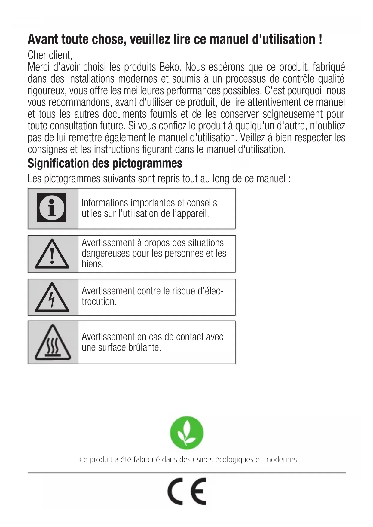 - Ütüleme tabanında (4) ıslak kumaş ütülenmiş / kireç lekesi oluşmuştur. >>> Yeterince soğuduktan sonra sirkeye batırılmış mikrofiber örgülü veya pamuklu bir bez ile ütüleme tabanını (4) silin.Avant toute chose, veuillez lire ce manuel d'utilisation ! Cher client, Merci d'avoir choisi les produits Beko. Nous espérons que ce produit, fabriqué dans des installations modernes et soumis à un processus de contrôle qualité rigoureux, vous offre les meilleures performances possibles. C'est pourquoi, nous vous recommandons, avant d'utiliser ce produit, de lire attentivement ce manuel et tous les autres documents fournis et de les conserver soigneusement pour toute consultation future. Si vous confiez le produit à quelqu'un d'autre, n'oubliez pas de lui remettre également le manuel d'utilisation. Veillez à bien respecter les consignes et les instructions figurant dans le manuel d'utilisation. Signification des pictogrammes Les pictogrammes suivants sont repris tout au long de ce manuel :