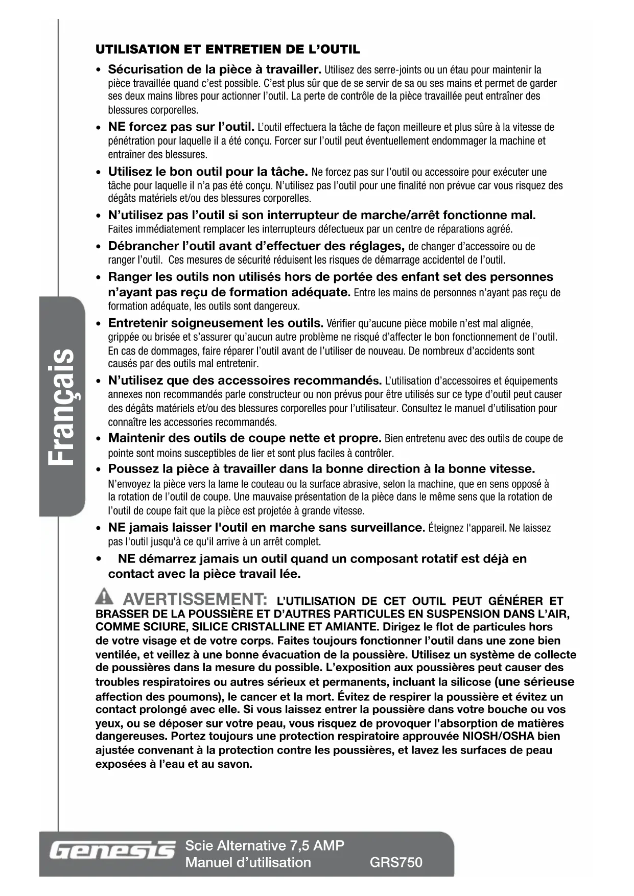 anti-poussière si vous générez de la poussière en coupant. Portez une protection de l’audition pendant de longues durées de coupe. Soutenez et maintenez bien les pièces travaillées. Conservez votre équilibre et ne travaillez pas à bout de bras.Français Scie Alternative 7,5 AMP Manuel d’utilisation GRS750 ENTRETIEN NETTOYAGE