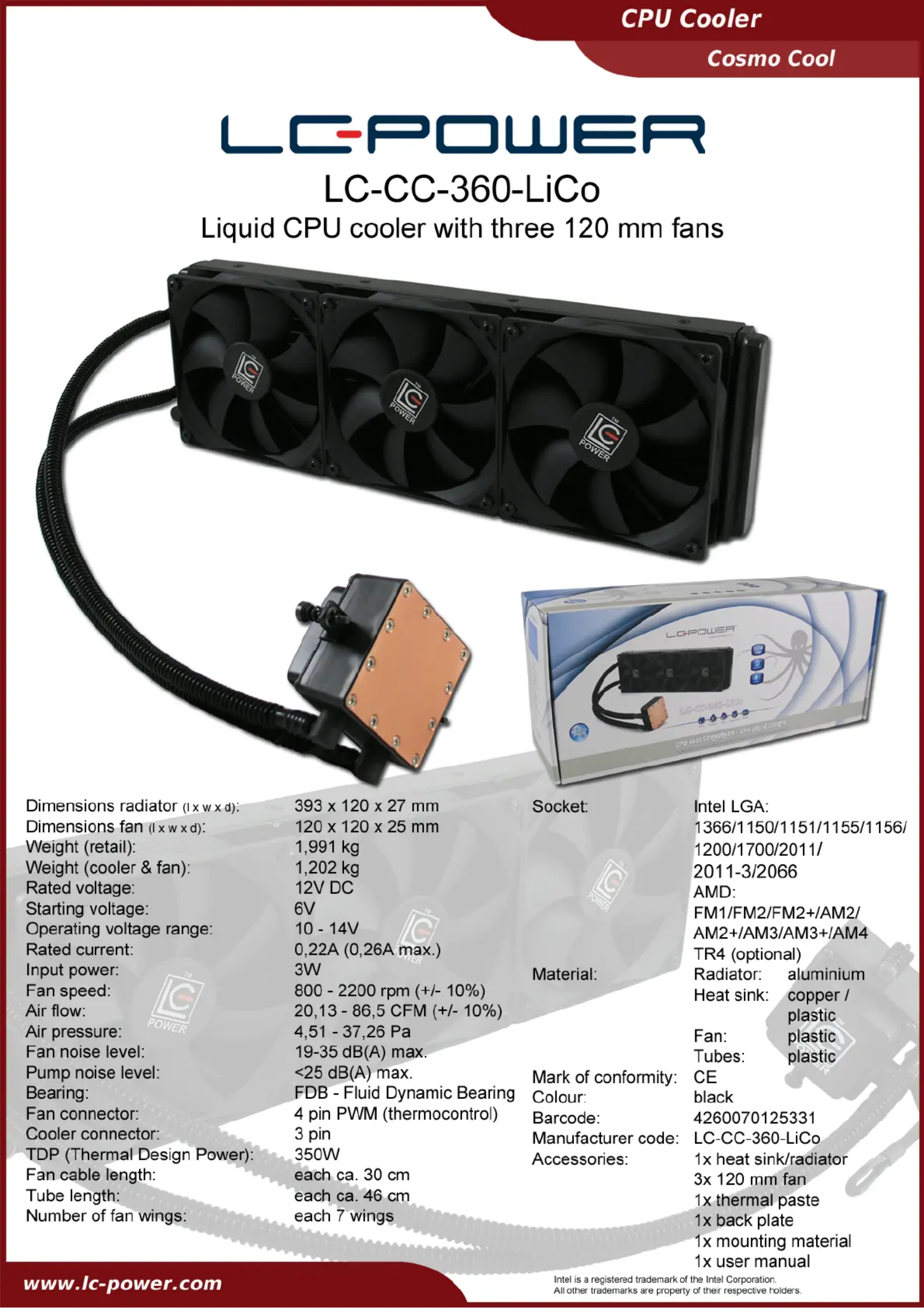 | Caractéristiques techniques | Ventirad pour processeur LC-Power CC360LiCo, compatible avec plusieurs sockets (Intel et AMD), dimensions compactes, design optimisé pour le flux d'air. |