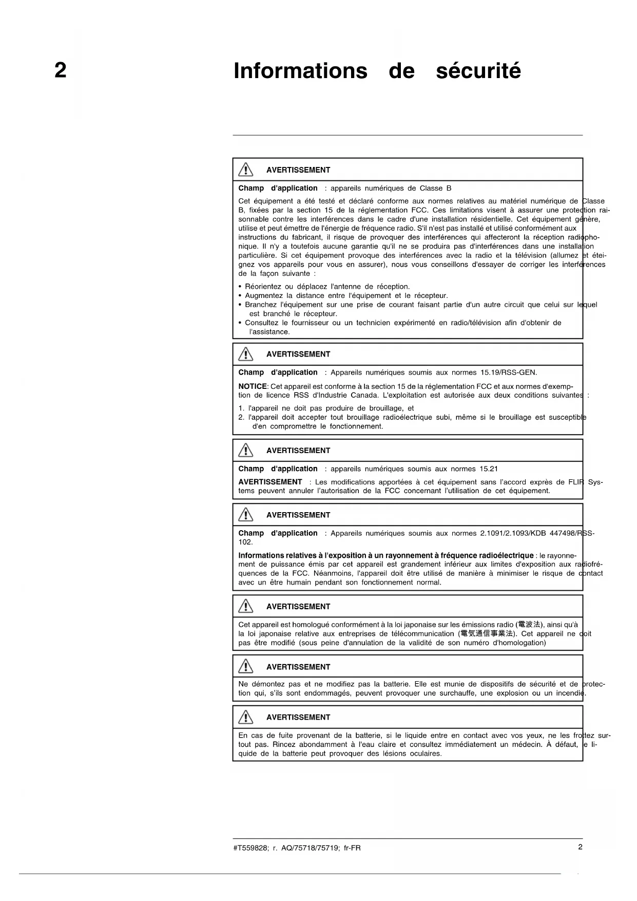 Informations relatives à l'exposition à un rayonnement à fréquence radioélectrique : le rayonne- ment de puissance émis par cet appareil est grandement inférieur aux limites d'exposition aux radiofré- quences de la FCC. Néanmoins, l'appareil doit être utilisé de manière à minimiser le risque de contact avec un être humain pendant son fonctionnement normal. AVERTISSEMENT Cet appareil est homologué conformément à la loi japonaise sur les émissions radio (電波法), ainsi qu'à la loi japonaise relative aux entreprises de télécommunication (電気通信事業法). Cet appareil ne doit pas être modifié (sous peine d'annulation de la validité de son numéro d'homologation) AVERTISSEMENT Ne démontez pas et ne modifiez pas la batterie. Elle est munie de dispositifs de sécurité et de protec- tion qui, s’ils sont endommagés, peuvent provoquer une surchauffe, une explosion ou un incendie. AVERTISSEMENT En cas de fuite provenant de la batterie, si le liquide entre en contact avec vos yeux, ne les frottez sur- tout pas. Rincez abondamment à l'eau claire et consultez immédiatement un médecin. À défaut, le li- quide de la batterie peut provoquer des lésions oculaires. #T559828; r. AQ/75718/75719; fr-FR 2Informations de sécurité