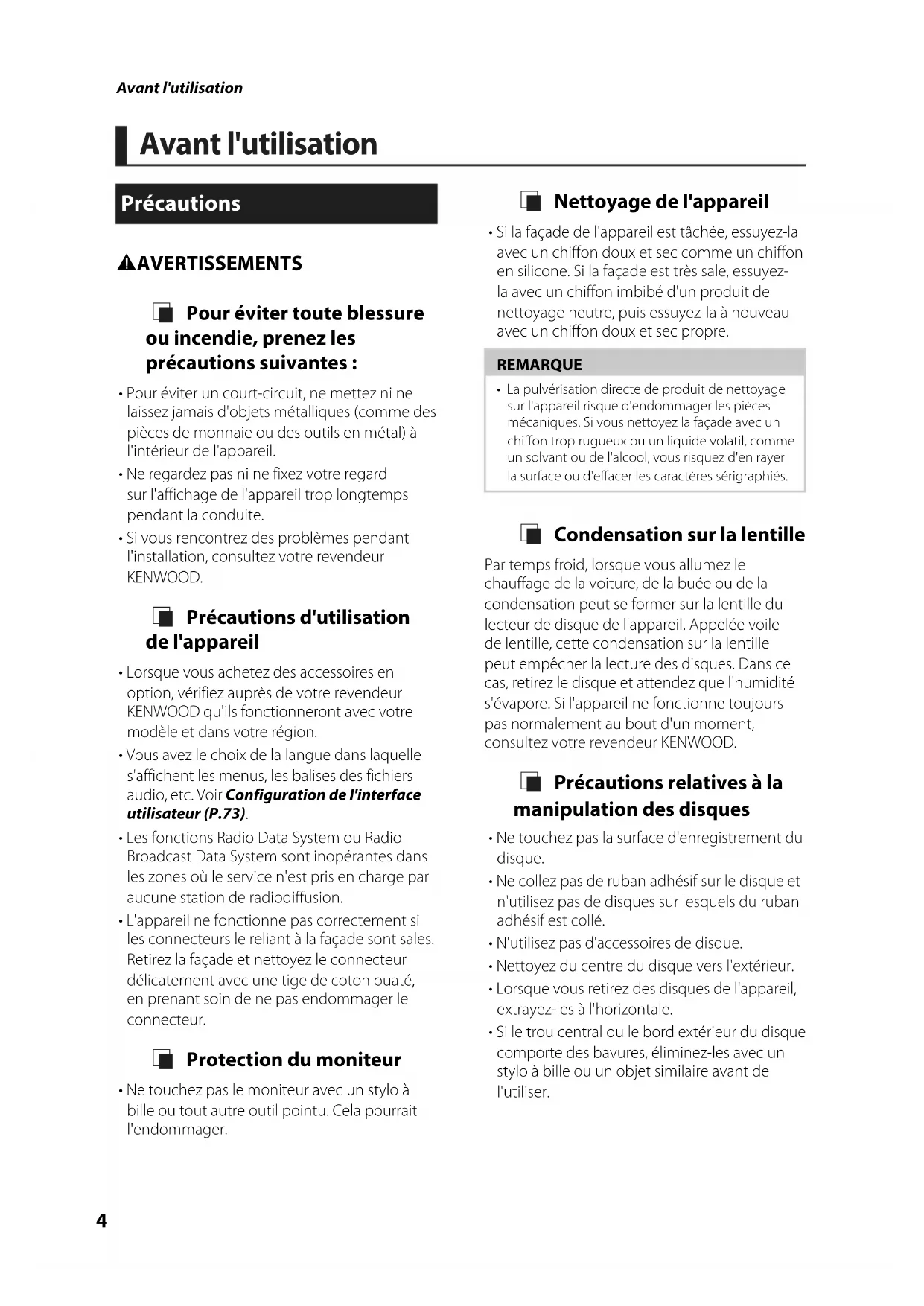 - Si vous rencontrez des problèmes pendant l'installation, consultez votre revendeur KENWOOD. Ñ Précautions d'utilisation de l'appareil