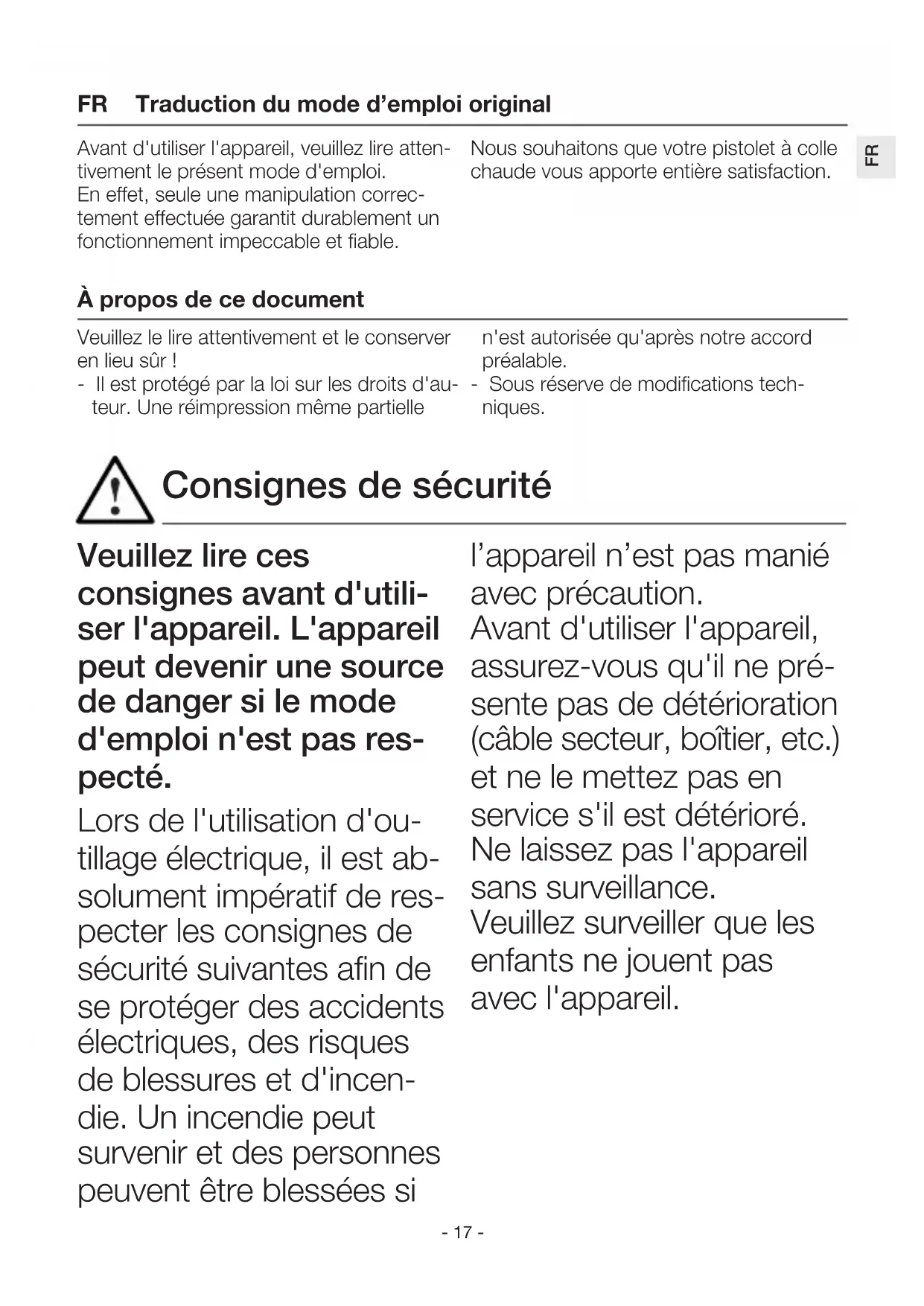 Veuillez lire ces consignes avant d'utili- ser l'appareil. L'appareil peut devenir une source de danger si le mode d'emploi n'est pas res- pecté. Lors de l'utilisation d'ou- tillage électrique, il est ab- solument impératif de res- pecter les consignes de sécurité suivantes afin de se protéger des accidents électriques, des risques de blessures et d'incen- die. Un incendie peut survenir et des personnes peuvent être blessées si l’appareil n’est pas manié avec précaution. Avant d'utiliser l'appareil, assurez-vous qu'il ne pré- sente pas de détérioration (câble secteur, boîtier, etc.) et ne le mettez pas en service s'il est détérioré. Ne laissez pas l'appareil sans surveillance. Veuillez surveiller que les enfants ne jouent pas avec l'appareil. Avant d'utiliser l'appareil, veuillez lire atten- tivement le présent mode d'emploi. En effet, seule une manipulation correc- tement effectuée garantit durablement un fonctionnement impeccable et fiable. Nous souhaitons que votre pistolet à colle chaude vous apporte entière satisfaction. Traduction du mode d’emploi original À propos de ce document Veuillez le lire attentivement et le conserver en lieu sûr ! - Il est protégé par la loi sur les droits d'au- teur. Une réimpression même partielle n'est autorisée qu'après notre accord préalable. - Sous réserve de modifications tech- niques. Consignes de sécurité FR- 18 - Tenez compte des conditions ambiantes. N'exposez jamais les appareils électriques à la pluie ou à l'humidité. N'uti- lisez pas l'appareil lorsqu'il est humide, ni dans un environnement humide ou mouillé. N'utilisez pas l'appareil à proximité de matières inflammables et ne le di- rigez pas longtemps vers le même endroit. N'utilisez pas l'appareil en présence d'une atmosphère explo- sive. La chaleur dégagée peut être transmise à des matériaux inflammables cachés. Protégez-vous contre les accidents électriques. Évitez de toucher des éléments mis à la terre comme tuyaux, radiateurs, cuisinières et réfrigérateurs. Ne laissez pas l'appareil sans surveillance tant qu'il fonctionne. Stockez l'appareil dans un endroit sûr. Après utilisation, posez l'appareil sur sa surface d'appui et laissez-le refroi- dir avant de le remballer. Lorsqu'il n'est pas utilisé, l'appareil doit être conser- vé dans un local fermé à l'abri de l'humidité et hors de portée des enfants. Les enfants de 8 ans et plus ainsi que les per- sonnes dont les capacités physiques, sensorielles ou mentales sont réduites ou qui manquent d'expé- rience et de connaissance peuvent utiliser cet ap- pareil s'ils sont surveillés ou s'ils ont été instruits en matière d'utilisation en Consignes de sécurité- 19 -