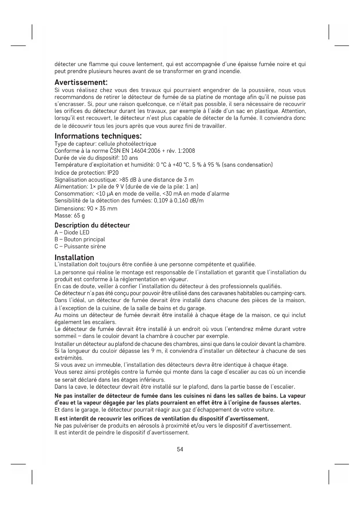 Si vous réalisez chez vous des travaux qui pourraient engendrer de la poussière, nous vous recommandons de retirer le détecteur de fumée de sa platine de montage afin qu‘il ne puisse pas s‘encrasser. Si, pour une raison quelconque, ce n‘était pas possible, il sera nécessaire de recouvrir les orifices du détecteur durant les travaux, par exemple à l‘aide d‘un sac en plastique. Attention, lorsqu‘il est recouvert, le détecteur n‘est plus capable de détecter de la fumée. Il conviendra donc de le découvrir tous les jours après que vous aurez fini de travailler. Informations techniques: Type de capteur: cellule photoélectrique Conforme à la norme ČSN EN 14604:2006 + rév. 1:2008 Durée de vie du dispositif: 10 ans Température d‘exploitation et humidité: 0 °C à +40 °C, 5 % à 95 % (sans condensation) Indice de protection: IP20 Signalisation acoustique: >85 dB à une distance de 3 m Alimentation: 1× pile de 9 V (durée de vie de la pile: 1 an) Consommation: <10 μA en mode de veille, <30 mA en mode d‘alarme Sensibilité de la détection des fumées: 0,109 à 0,160 dB/m Dimensions: 90 × 35 mm Masse: 65 g Description du détecteur A – Diode LED B – Bouton principal C – Puissante sirène Installation L‘installation doit toujours être confiée à une personne compétente et qualifiée. La personne qui réalise le montage est responsable de l‘installation et garantit que l‘installation du produit est conforme à la réglementation en vigueur. En cas de doute, veiller à confier l‘installation du détecteur à des professionnels qualifiés. Ce détecteur n‘a pas été conçu pour pouvoir être utilisé dans des caravanes habitables ou camping-cars. Dans l‘idéal, un détecteur de fumée devrait être installé dans chacune des pièces de la maison, à l‘exception de la cuisine, de la salle de bains et du garage. Au moins un détecteur de fumée devrait être installé à chaque étage de la maison, ce qui inclut également les escaliers. Le détecteur de fumée devrait être installé à un endroit où vous l‘entendrez même durant votre sommeil – dans le couloir devant la chambre à coucher par exemple. Installer un détecteur au plafond de chacune des chambres, ainsi que dans le couloir devant la chambre. Si la longueur du couloir dépasse les 9 m, il conviendra d‘installer un détecteur à chacune de ses extrémités. Si vous avez un immeuble, l‘installation des détecteurs devra être identique à chaque étage. Vous serez ainsi protégés contre la fumée qui monte dans la cage d‘escalier au cas où un incendie se serait déclaré dans les étages inférieurs. Dans la cave, le détecteur devrait être installé sur le plafond, dans la partie basse de l‘escalier. Ne pas installer de détecteur de fumée dans les cuisines ni dans les salles de bains. La vapeur d‘eau et la vapeur dégagée par les plats pourraient en effet être à l‘origine de fausses alertes. Et dans le garage, le détecteur pourrait réagir aux gaz d‘échappement de votre voiture. Il est interdit de recouvrir les orifices de ventilation du dispositif d‘avertissement. Ne pas pulvériser de produits en aérosols à proximité et/ou vers le dispositif d‘avertissement. Il est interdit de peindre le dispositif d‘avertissement.55 Figures illustrant l‘installation du détecteur: 1.Orifices dans le plafond (le mur); 2. Chevilles; 3. Platine de montage; 4. Vis; 5. Détecteur Installation du dispositif sur un mur – description Percer deux orifices (de ø 5 mm) dans le mur (1). La distance séparant les deux orifices devrait être de 60 mm. Introduire des chevilles dans les orifices (2), présenter la platine de montage (3) et la fixer au mur à l‘aide de vis. Introduire et raccorder la pile du détecteur – figures (D et E) et faire ensuite un test de fonctionnement – voir le Mode des essais. Si le détecteur est opérationnel, placer la face arrière du détecteur sur les deux plots de fixation de la platine de montage et faire pivoter le détecteur pour le bloquer. Commentaire: La réglementation applicable au nombre et à l‘emplacement des détecteurs de fumée peut varier d‘un pays à l‘autre. En cas de doute, il faudra donc que vous consultiez, par exemple, un corps de sapeurs-pompiers actif dans votre pays. Croquis représentant un emplacement correct du détecteur NE PAS INSTALLER ICI