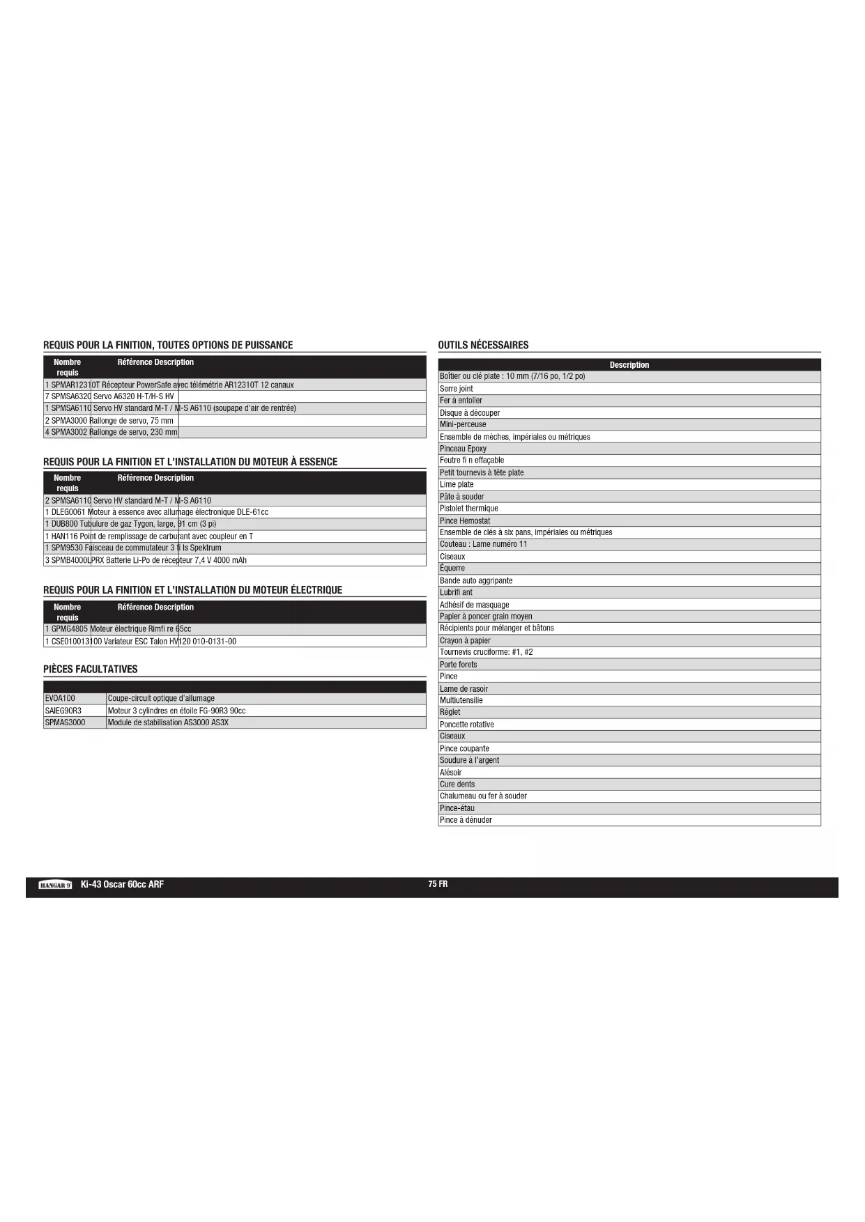 - Nous vous recommandons d’affecter maintenant le récepteur à l’émetteur en suivant les instructions fournies avec votre radio. REMARQUE: Reconnectez le système radio une fois que tous les coudes de contrôle sont confi gurés. Cette action empêche les servos de se déplacer vers leurs extrémités jusqu’à la connexion de l’émetteur et du récepteur. Cela garantit aussi que les paramètres d’inversion du servo sont enregistrés dans le système radio.74FR Référence Description HAN472001 KI-43 Oscar 60cc Fuselage uniquement HAN472002 Trappe avec verrière: Ki-43 60cc HAN472003 Aile gauche avec aileron et volet: Ki-43 60cc HAN472004 Aile droite avec aileron et volet: Ki-43 60cc HAN472005 Stabilisateur avec fi let: KI-43 60cc HAN472006 Gouverne de direction: Ki-43 60cc HAN472007 Capot et moteur factice: Ki-43 60cc HAN472008 Trappe supérieure: Ki-43 60cc HAN472009 Verrière: Ki-43 60cc HAN472010 Pilote peint: Ki-43 60cc HAN472011 Sachet de visserie: Ki-43 60cc HAN472012 Roues principales 12cm (5 pouces): Ki-43 60cc HAN472013 Assemblage de roulette de queue: Ki-43 60cc HAN472014 Jeu de tringleries: Ki-43 60cc HAN472015 Cône 95,25 mm: Ki-43 60cc HAN472016 Clé d’aile: Ki-43 60cc HAN472017 Réservoir de carburant: Ki-43 60cc HAN472018 Jeu de renforts moteur EP: Ki-43 60cc HAN472019 Ensemble de trappe de train: Ki-43 60cc HAN472020 Détails à l’échelle: Ki-43 60cc HAN472025 Jeu de systèmes de rentrée: Ki-43 60cc HAN472026 Systèmes de rentrée et haubans: Ki-43 60cc HAN472027 Quincaillerie du système d’air: Ki-43 60 cc HAN472028 Haubans de rentrée: Ki-43 60cc