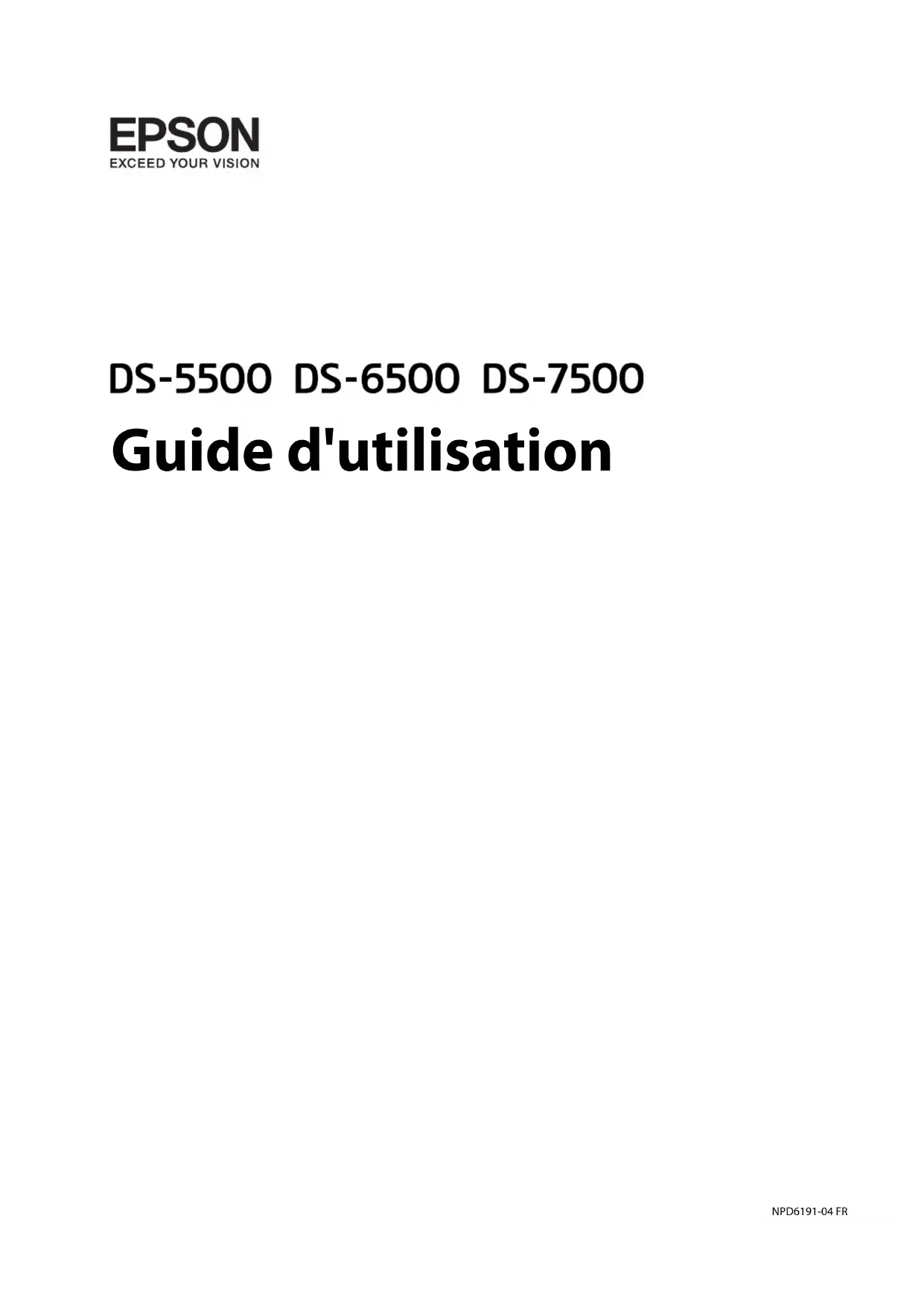 http://epson.sn Remarque: Pour Windows, vous pouvez également utiliser le CD du logiciel fourni avec le scanner. Guide d'utilisation Résolution des problèmes 73Caractéristiques techniques Caractéristiques générales du scanner Remarque: Les caractéristiques techniques peuvent être modiées sans préavis. Type de scanner Couleur à platDispositif photoélectrique Capteur CCD couleur linéairePixels eectifs 10,200×14,040 à 1200 ppp5,100×8400 à 600 pppSource lumineuse Diode électroluminescente blancheRésolution de numérisation Vitre du scanner :1200 ppp (numérisation principale)1200 ppp (numérisation secondaire)Chargeur automatique de documents :600 ppp (numérisation principale)600 ppp (numérisation secondaire)Résolution de sortie50 à 9600 ppp (par pas de 1 ppp) Taille du document Vitre du scanner :216×297 mm (8.5×11.7 pouces)Chargeur automatique de documents216×1,016 mm (8.5×40 pouces)Insertion de papier dans le ADF Chargement face vers le hautSortie du papier par le ADF Éjection face vers le basCapacité papier du ADF 100 feuilles de papier à 80 g/mProfondeur de couleur 16 bits par pixel par couleur interne1 à 8 bits par pixel par couleur externeInterface Port USB haute vitesse Remarque: La résolution optique en option est la résolution de numérisation maximale des éléments CCD, conformément à la norme ISO 14473. La norme ISO 14473 dénit la résolution optique comme le taux d’échantillonnage fondamental du capteur du scanner. Guide d'utilisation Caractéristiques techniques 74Dimensions et poids Dimensions* DS-5500 : Largeur : 495 mm (19.5 pouces) Profondeur : 360 mm (14.2 pouces) Hauteur : 129 mm (5.1 pouces) DS-6500/DS-7500 : Largeur : 495 mm (19.5 pouces) Profondeur : 360 mm (14.2 pouces) Hauteur : 217 mm (8.6 pouces) Poids DS-5500 : Environ 6.0 kg (13.3 lb) DS-6500/DS-7500 : Environ 9.8 kg (21.6 lb)