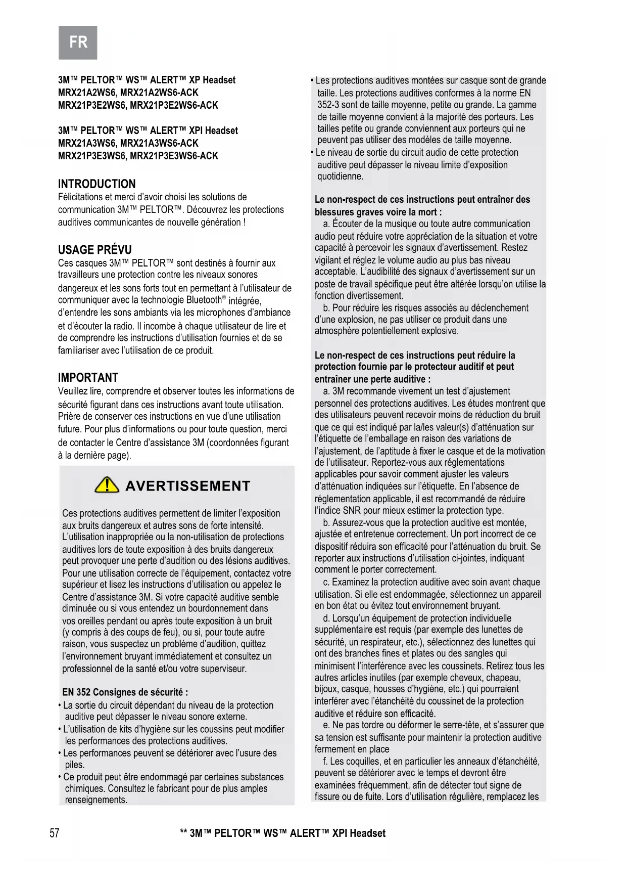 AVERTISSEMENT Ces protections auditives permettent de limiter l’exposition aux bruits dangereux et autres sons de forte intensité. L’utilisation inappropriée ou la non-utilisation de protections auditives lors de toute exposition à des bruits dangereux peut provoquer une perte d’audition ou des lésions auditives. Pour une utilisation correcte de l’équipement, contactez votre supérieur et lisez les instructions d’utilisation ou appelez le Centre d’assistance 3M. Si votre capacité auditive semble diminuée ou si vous entendez un bourdonnement dans vos oreilles pendant ou après toute exposition à un bruit (y compris à des coups de feu), ou si, pour toute autre raison, vous suspectez un problème d’audition, quittez l’environnement bruyant immédiatement et consultez un professionnel de la santé et/ou votre superviseur.EN 352 Consignes de sécurité :• La sortie du circuit dépendant du niveau de la protection auditive peut dépasser le niveau sonore externe.• L’utilisation de kits d’hygiène sur les coussins peut modier les performances des protections auditives.• Les performances peuvent se détériorer avec l’usure des piles. • Ce produit peut être endommagé par certaines substances chimiques. Consultez le fabricant pour de plus amples renseignements.• Les protections auditives montées sur casque sont de grande taille. Les protections auditives conformes à la norme EN 352-3 sont de taille moyenne, petite ou grande. La gamme de taille moyenne convient à la majorité des porteurs. Les tailles petite ou grande conviennent aux porteurs qui ne peuvent pas utiliser des modèles de taille moyenne.• Le niveau de sortie du circuit audio de cette protection auditive peut dépasser le niveau limite d’exposition quotidienne.Le non-respect de ces instructions peut entraîner des blessures graves voire la mort :a. Écouter de la musique ou toute autre communication audio peut réduire votre appréciation de la situation et votre capacité à percevoir les signaux d’avertissement. Restez vigilant et réglez le volume audio au plus bas niveau acceptable. L’audibilité des signaux d’avertissement sur un poste de travail spécique peut être altérée lorsqu’on utilise la fonction divertissement.b. Pour réduire les risques associés au déclenchement d’une explosion, ne pas utiliser ce produit dans une atmosphère potentiellement explosive.Le non-respect de ces instructions peut réduire la protection fournie par le protecteur auditif et peut entraîner une perte auditive :a. 3M recommande vivement un test d’ajustement personnel des protections auditives. Les études montrent que des utilisateurs peuvent recevoir moins de réduction du bruit que ce qui est indiqué par la/les valeur(s) d’atténuation sur l’étiquette de l’emballage en raison des variations de l’ajustement, de l’aptitude à xer le casque et de la motivation de l’utilisateur. Reportez-vous aux réglementations applicables pour savoir comment ajuster les valeurs d’atténuation indiquées sur l’étiquette. En l’absence de réglementation applicable, il est recommandé de réduire l’indice SNR pour mieux estimer la protection type. b. Assurez-vous que la protection auditive est montée, ajustée et entretenue correctement. Un port incorrect de ce dispositif réduira son efcacité pour l’atténuation du bruit. Se reporter aux instructions d’utilisation ci-jointes, indiquant comment le porter correctement.c. Examinez la protection auditive avec soin avant chaque utilisation. Si elle est endommagée, sélectionnez un appareil en bon état ou évitez tout environnement bruyant.d. Lorsqu’un équipement de protection individuelle supplémentaire est requis (par exemple des lunettes de sécurité, un respirateur, etc.), sélectionnez des lunettes qui ont des branches nes et plates ou des sangles qui minimisent l’interférence avec les coussinets. Retirez tous les autres articles inutiles (par exemple cheveux, chapeau, bijoux, casque, housses d’hygiène, etc.) qui pourraient interférer avec l’étanchéité du coussinet de la protection auditive et réduire son efcacité.e. Ne pas tordre ou déformer le serre-tête, et s’assurer que sa tension est sufsante pour maintenir la protection auditive fermement en placef. Les coquilles, et en particulier les anneaux d’étanchéité, peuvent se détériorer avec le temps et devront être examinées fréquemment, an de détecter tout signe de ssure ou de fuite. Lors d’utilisation régulière, remplacez les