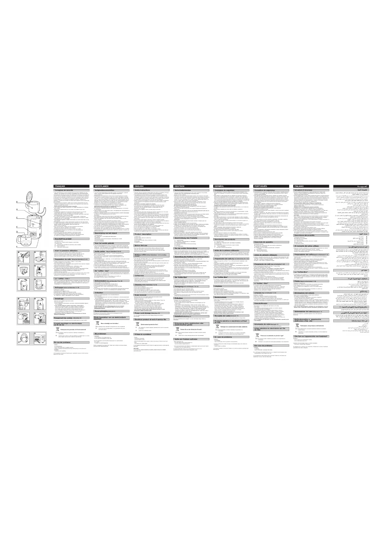- détartrez votre cafetière. Votre appareil ne fonctionne toujours pas ? Adressez-vous à un centre service agréé (voir liste jointe). FRANÇAIS Consignes de sécurité Descriptif du produit Avant la premiere utilisation Preparation du cafe Suivez les illustrations (1 à 6) La « coffee – box » Nettoyage (suivez les illustration 7 à 10) Detartrage Rangement du cordon (illustration 11) En cas de probleme Produit electrique ou electronique en fin de vie