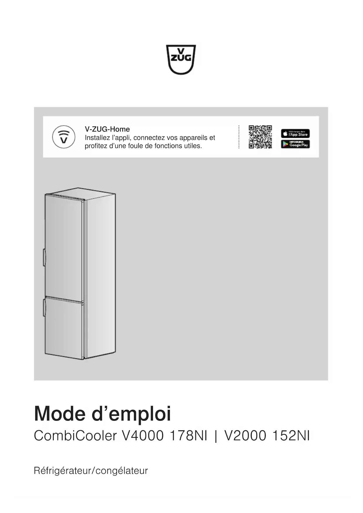 Mode d’emploi CombiCooler V4000 178NI | V2000 152NI Réfrigérateur/congélateur V-ZUG-Home Installez l’appli, connectez vos appareils et profitez d’une foule de fonctions utiles.Merci d’avoir porté votre choix sur l’un de nos produits. Votre nouvel appareil répond aux exigences les plus élevées et son utilisation est des plus simples. Accordez-vous toutefois le temps de lire ce mode d’emploi. Vous vous familiariserez ainsi avec votre ap- pareil, ce qui vous permettra de l’utiliser de manière optimale et sans dérangement. Tenez compte des consignes de sécurité. Modifications Le texte, les illustrations et les données correspondent au niveau technique de l’appareil au moment de la mise sous presse de ce mode d’emploi. Sous réserve de modifications dans le cadre du progrès technique. Domaine de validité Ce mode d’emploi est valable pour: Désignation du modèle Type Numéro de modèle Système de mesure CombiCoolerV4000178NI CCO4T-51108 51108 SMS55/Euro60 CombiCoolerV2000152NI CCO2T-51107 51107 SMS55/Euro60 Les différences d’exécution sont mentionnées dans le texte. © V-ZUG SA, CH-6302 Zug, 2022